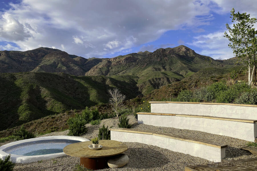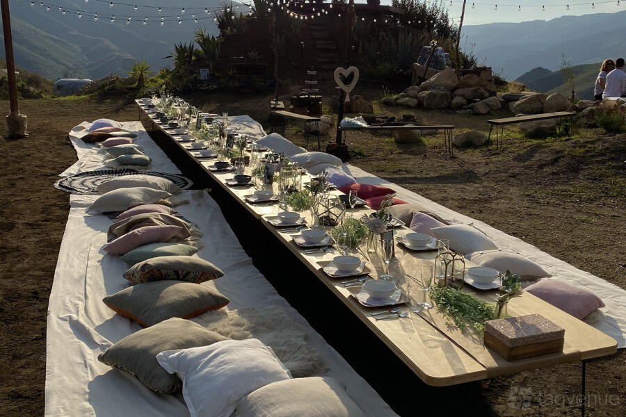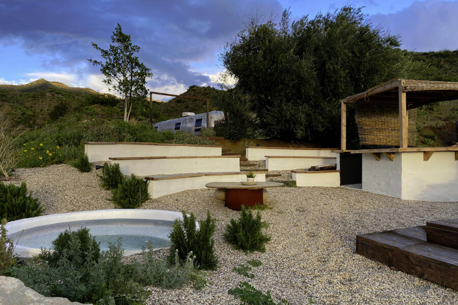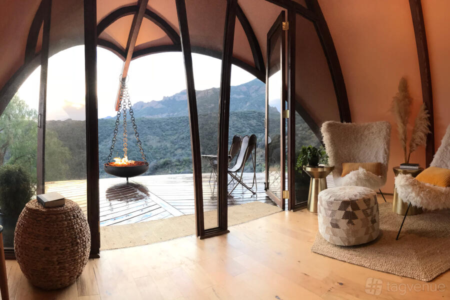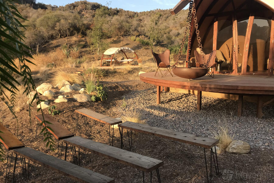 The property features a spacious hilltop deck with a large renaissance fire cauldron, panoramic views, and custom seating, offering a perfect backdrop for relaxation or events. The interior boasts elegantly arched spaces, including a living room, kitchenette, bedroom, bathroom, and dressing room.