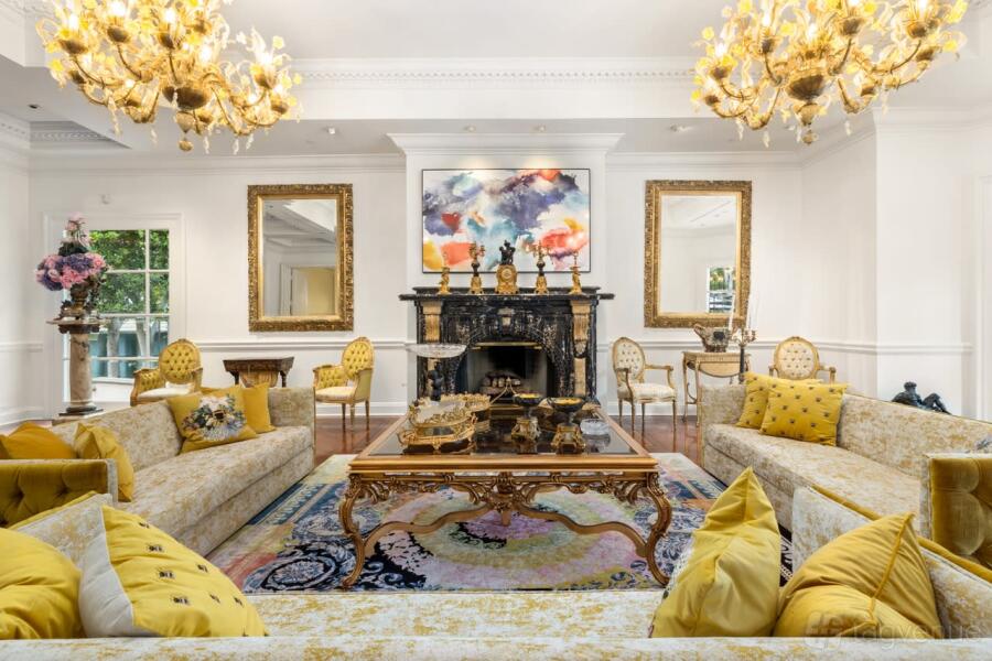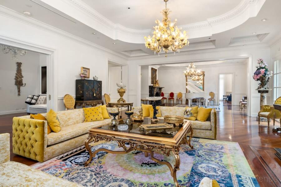 The Palace house features indoor and outdoor spaces, including a marble foyer, formal living room, and garden with a heated pool and spa.