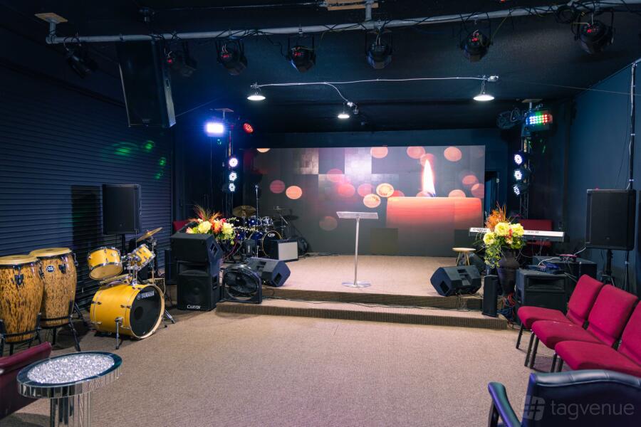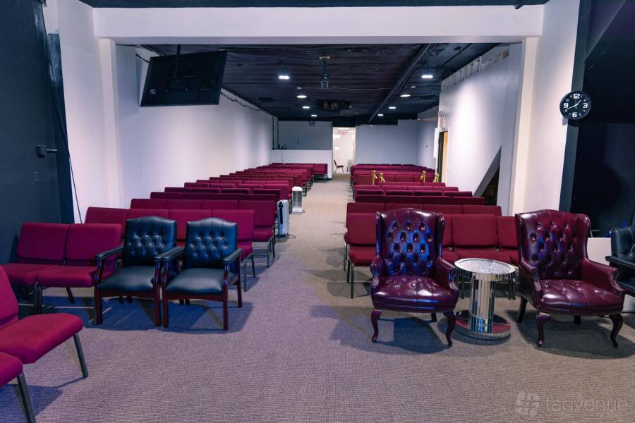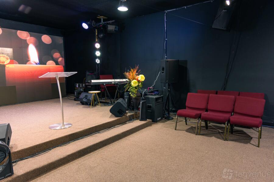 The space features a stage and comfortable seating, creating a warm yet focused atmosphere. The layout is adaptable and ideal for gatherings that require both an intimate and professional feel.