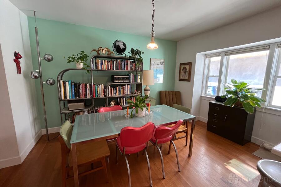 The home is filled with thoughtful artwork and pieces that reflect the creative spirit of the owners, who are both artists and small business owners. The blend of vintage style and modern amenities creates a relaxed and inspiring environment. The cozy porch and the large backyard garden offer additional spaces for relaxation or for staging production activities.