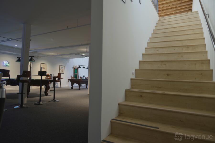 The decor is modern and stylish, with comfortable seating areas and a warm, cozy atmosphere. The wooden floors and high ceilings give the space an open and inviting feel. There are big, soft chairs and couches where you can sit, relax, and watch games on large TV screens. The lighting is perfect for setting a cool, laid-back mood.