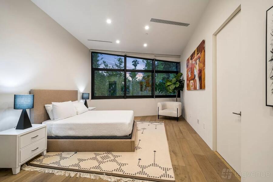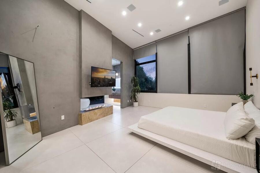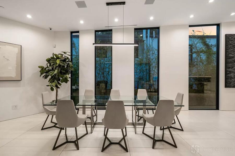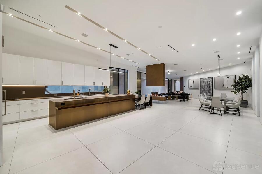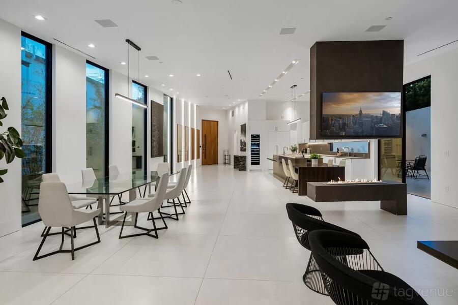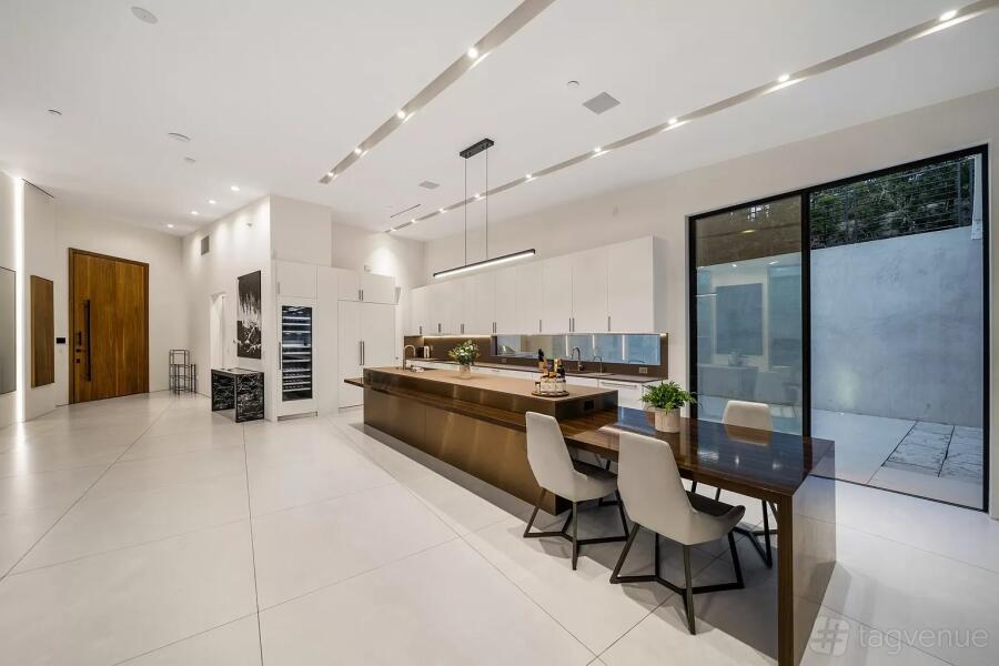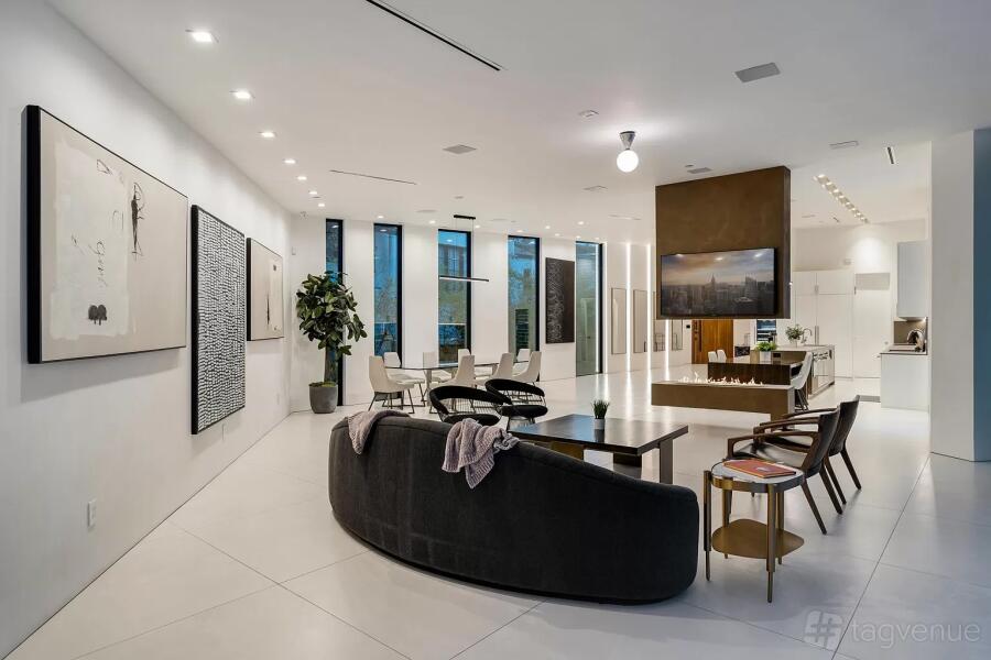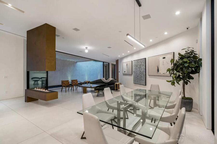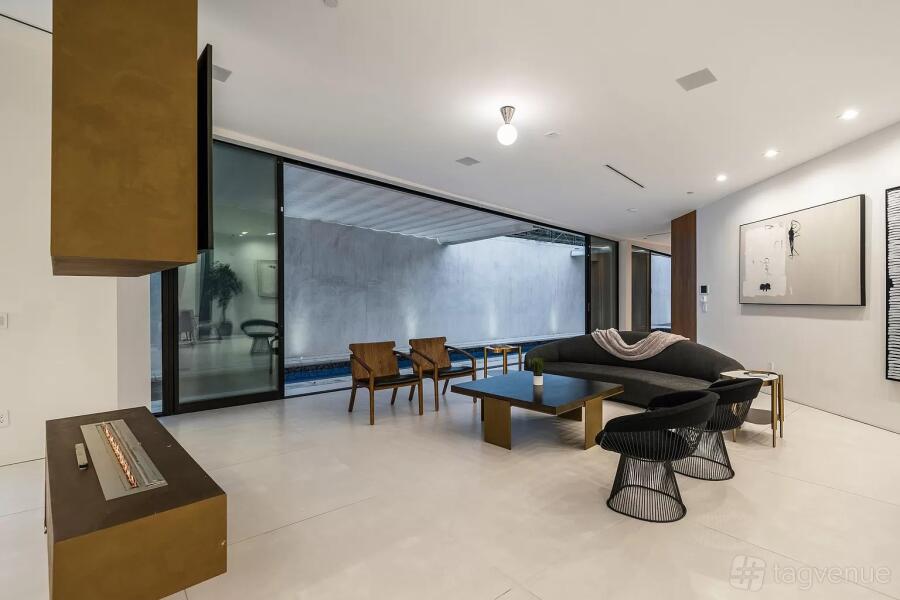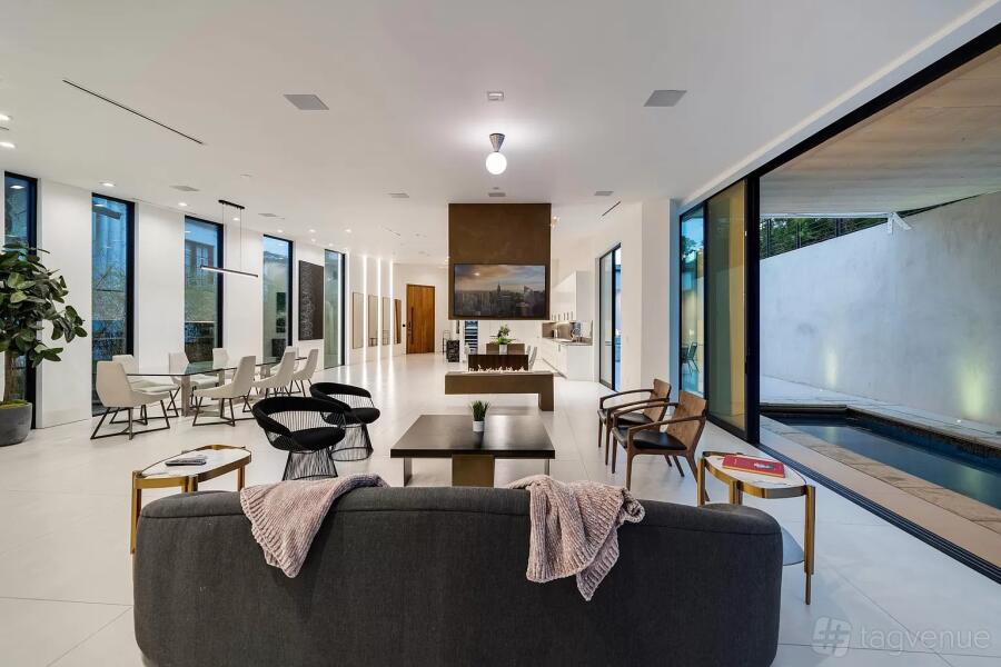 The home features 70 feet of sliding glass doors that open up to an expansive outdoor area complete with an 80-foot lap pool, outdoor dining space, BBQ station, and a separate lounge with a fire pit. Inside, high ceilings, clean lines, and an abundance of natural light create an airy ambiance. The property’s convenient location offers quick access to Hollywood’s renowned nightlife and dining, while still providing privacy and breathtaking views of downtown Los Angeles. Exact address upon booking.