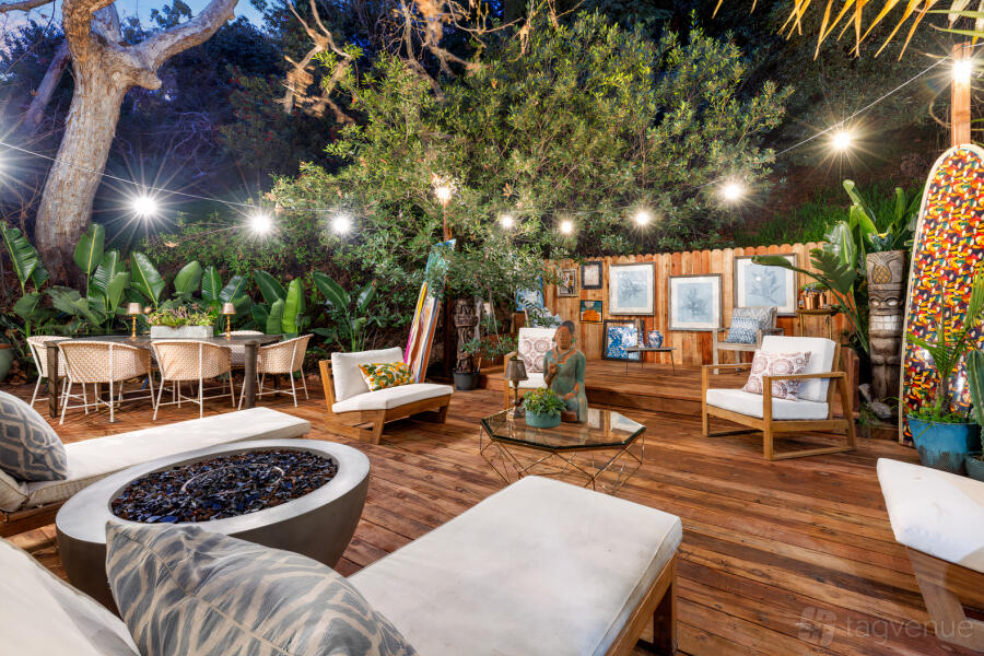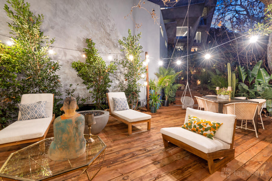 The backyard contains a Tulum-inspired zen garden and deck, with a dining table, sunbeds, lounge chairs, and a firepit.