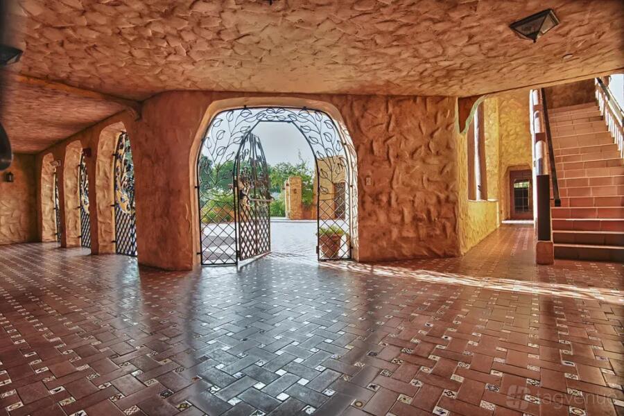 Set on a beautifully landscaped triangular lot, the mansion is approached through Pueblo Revival gatehouses that complement its architectural style. A winding driveway, flanked by stately royal palms and leading to a free-form pond, enhances the grandeur of the mansion's entrance.