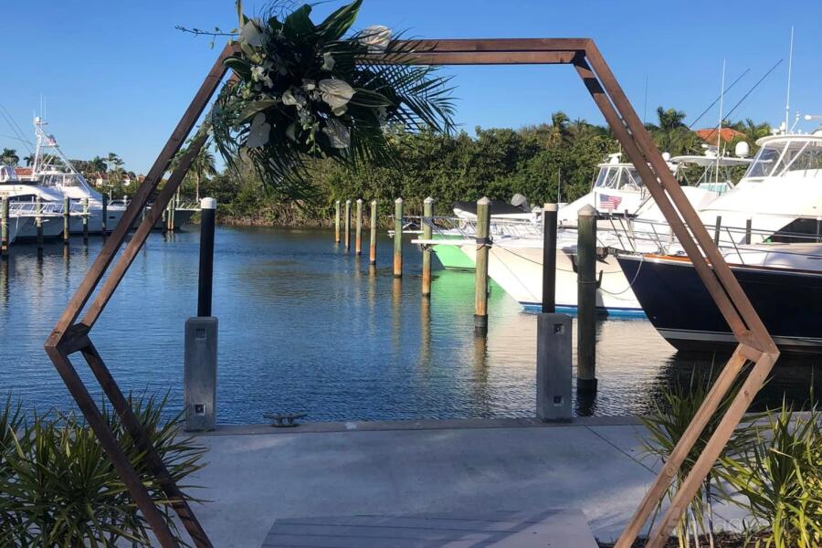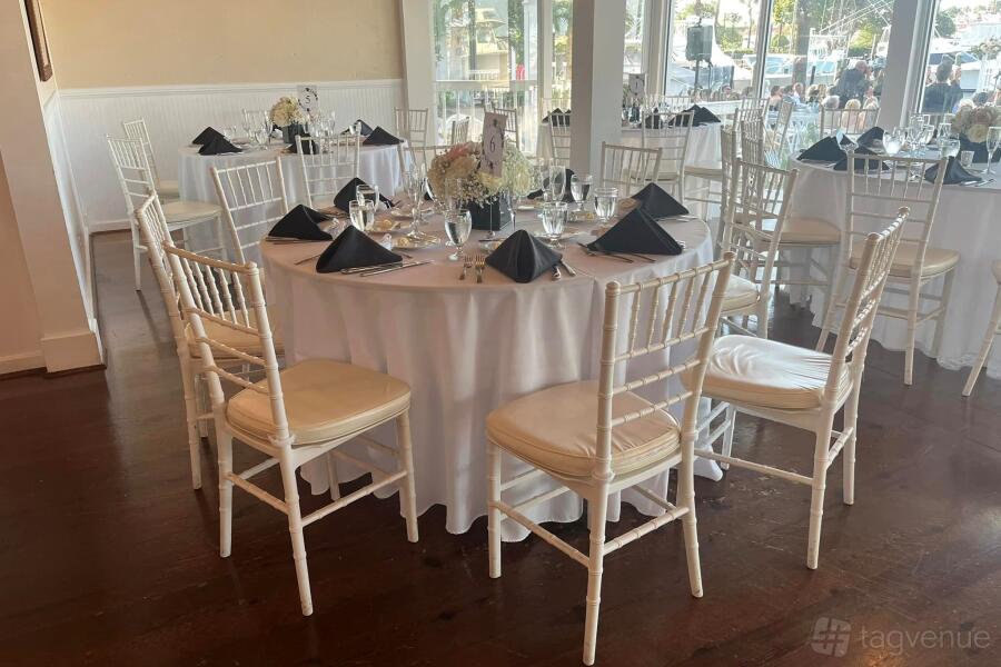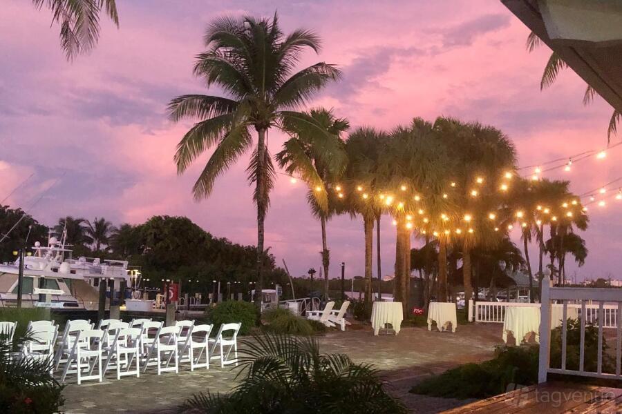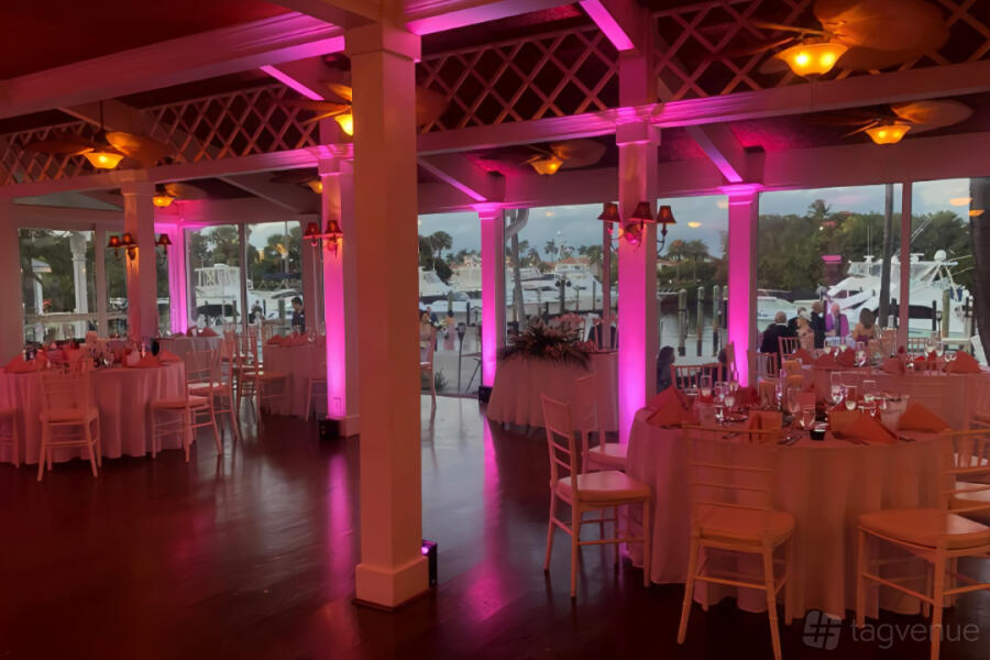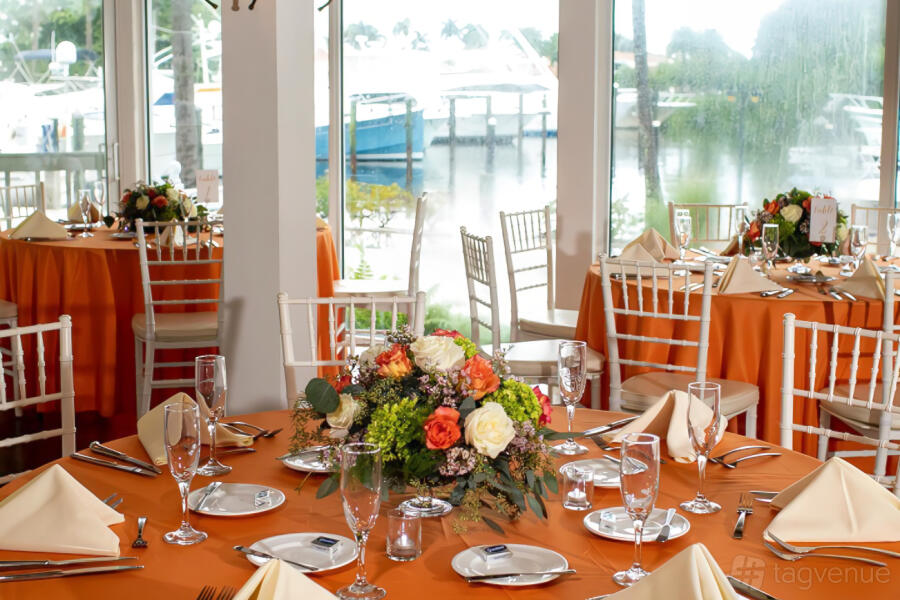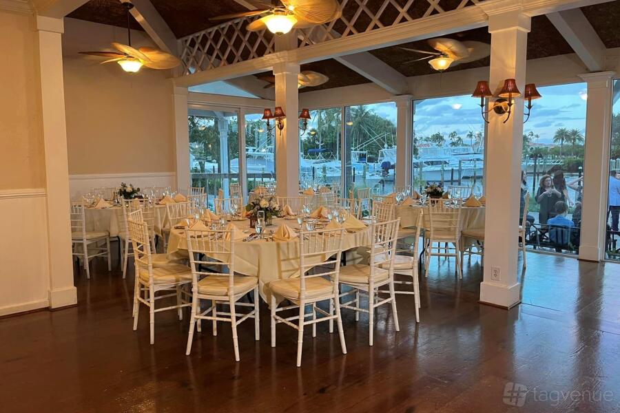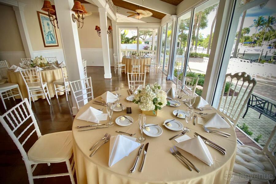 The reception room has floor to ceiling windows overlooking the Loggerhead Marina.