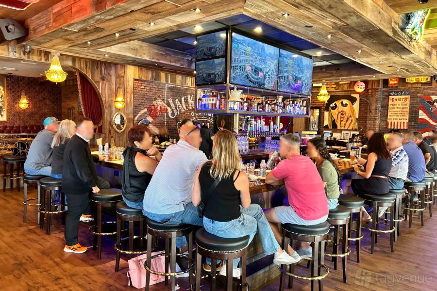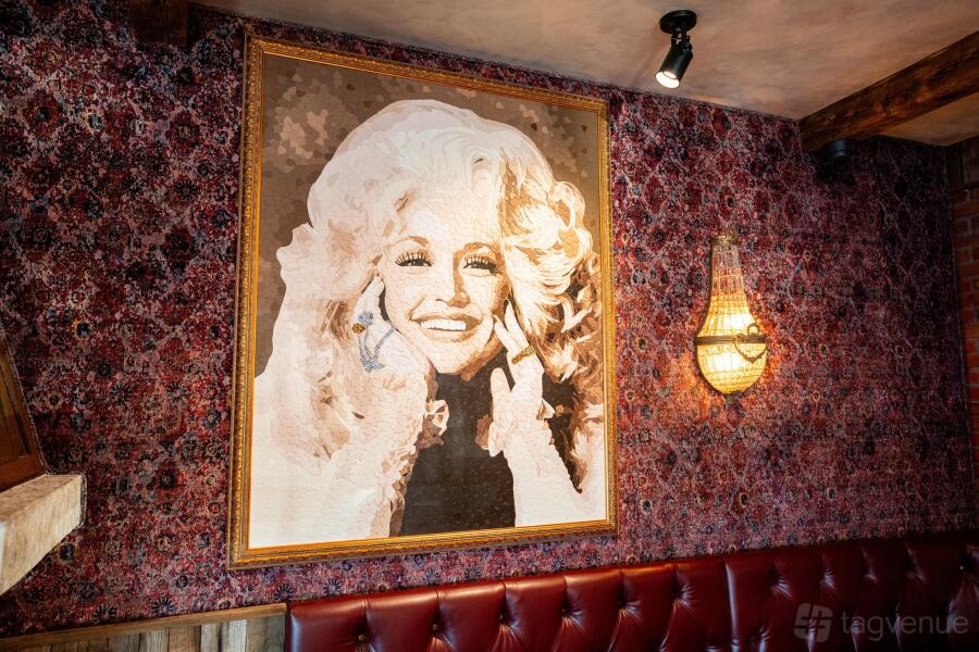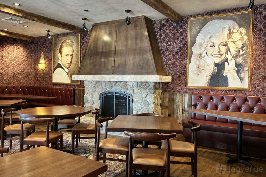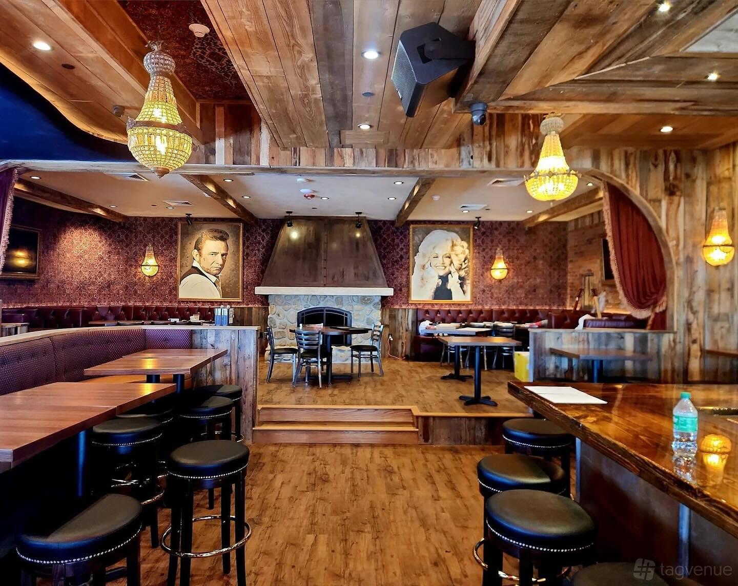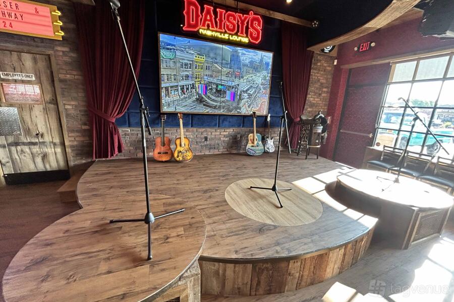 The style of Daisy's Nashville Lounge is inspired by the charm of Nashville, with country music posters, wooden furniture, and a cozy, welcoming vibe. The lighting is soft, creating a comfortable environment, while the spacious layout allows for different seating arrangements and plenty of room for dancing or activities.