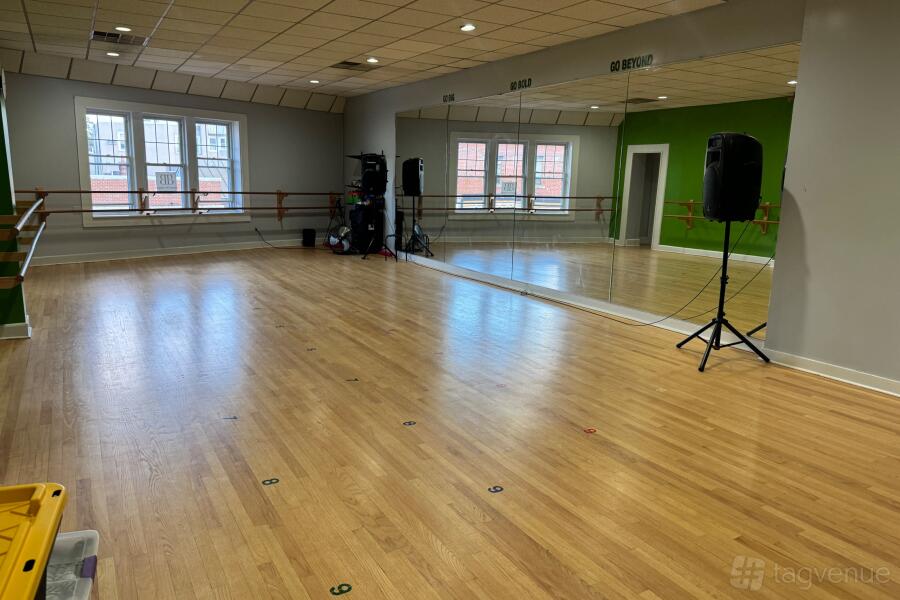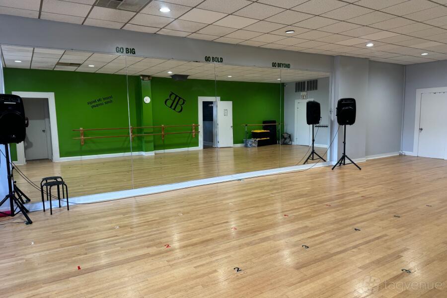 One studio fits up to 10 people. It is excellent for intimate rehearsals. The larger room holds up to 15 guests. It is ideal for classes and photoshoots. Metered street parking and a nearby lot are available.