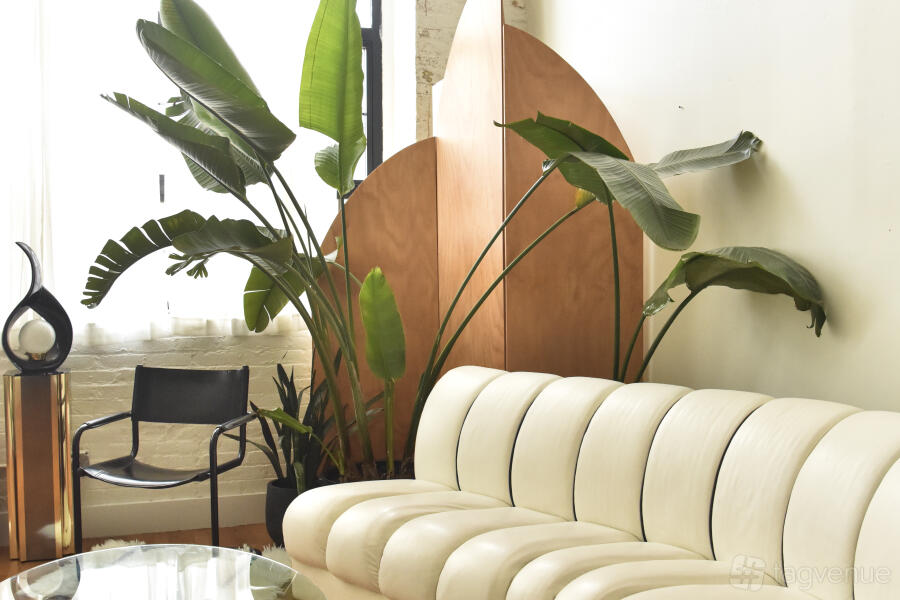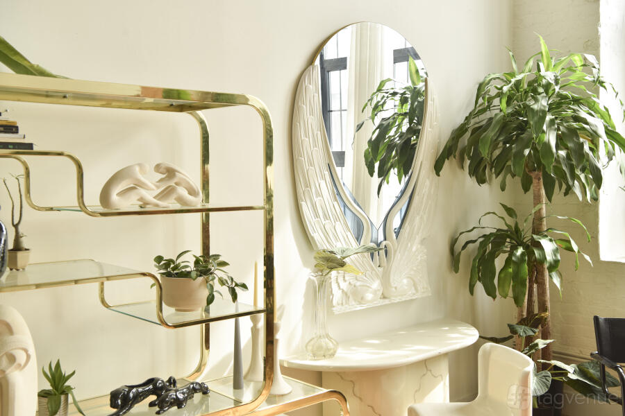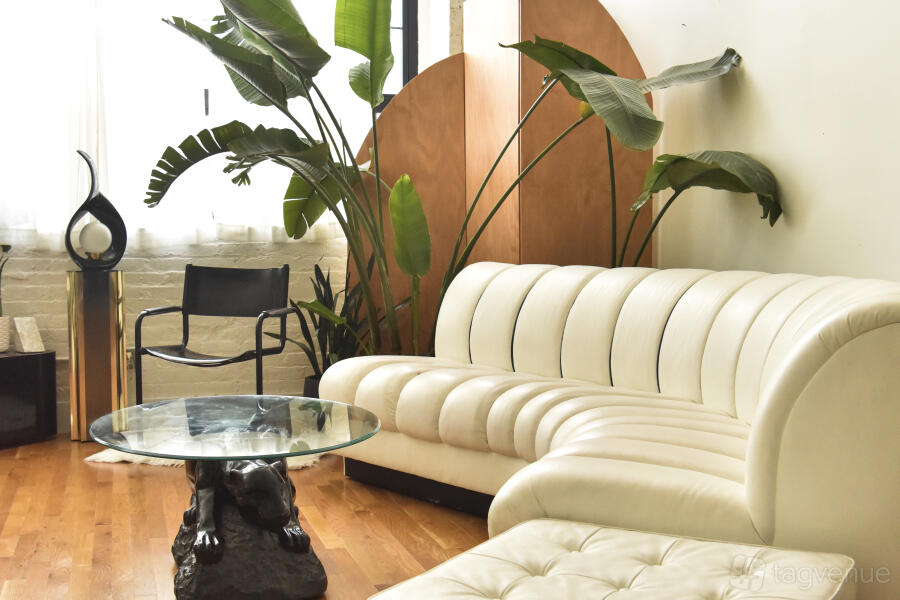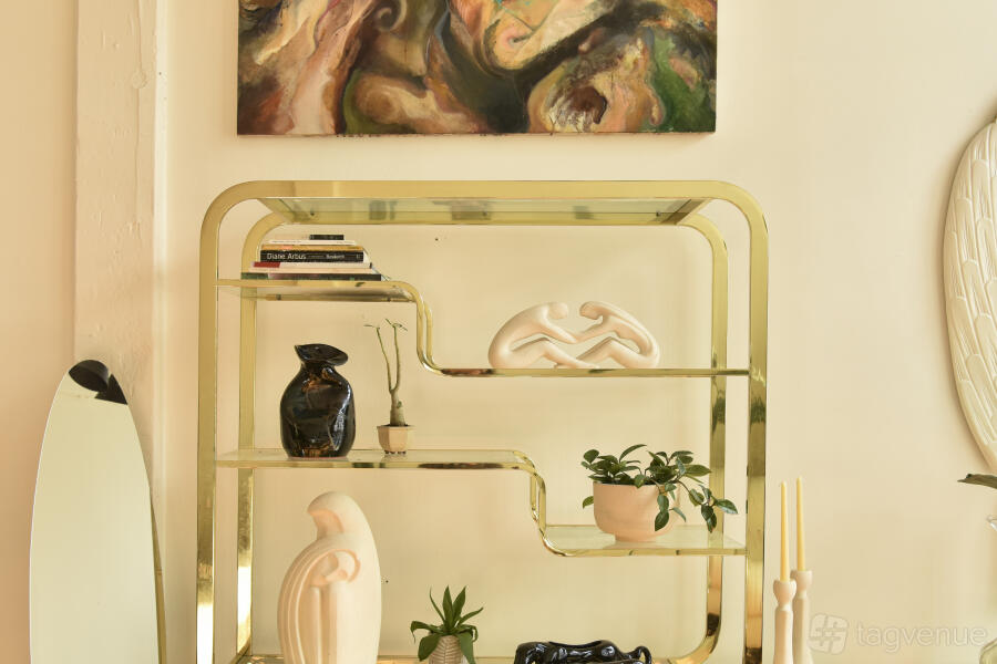 The loft is curated with ironic Art Deco pieces: 1970s Mart Stam Style Black Leather Cantilever Armchair, Onyx folding mid century bar cart, black panther coffee table, 1970s Milo Baughman Style Brass And Glass Etagere By Design Institutes Of America, lipstick mirrors, curved sofa, vintage 1980s Art Deco lamps, Haeger pottery, and more.