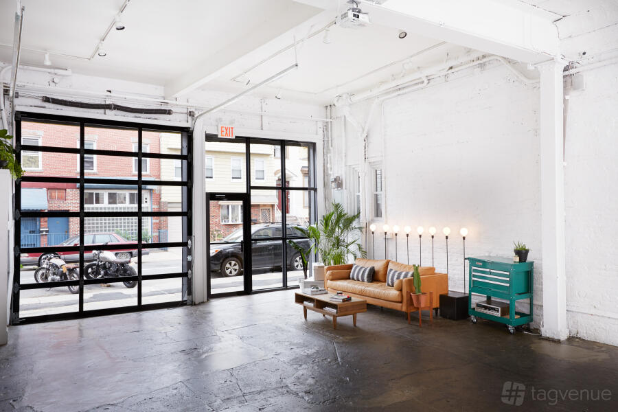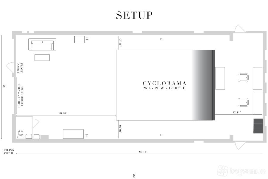 Our cyc measures 19’W x 26’D x 13’H with curves at the top and bottom. We are conveniently located on the ground floor with a private entrance, and our garage door opens all the way to 10’ x 12’ for maximum ease in loading and unloading.