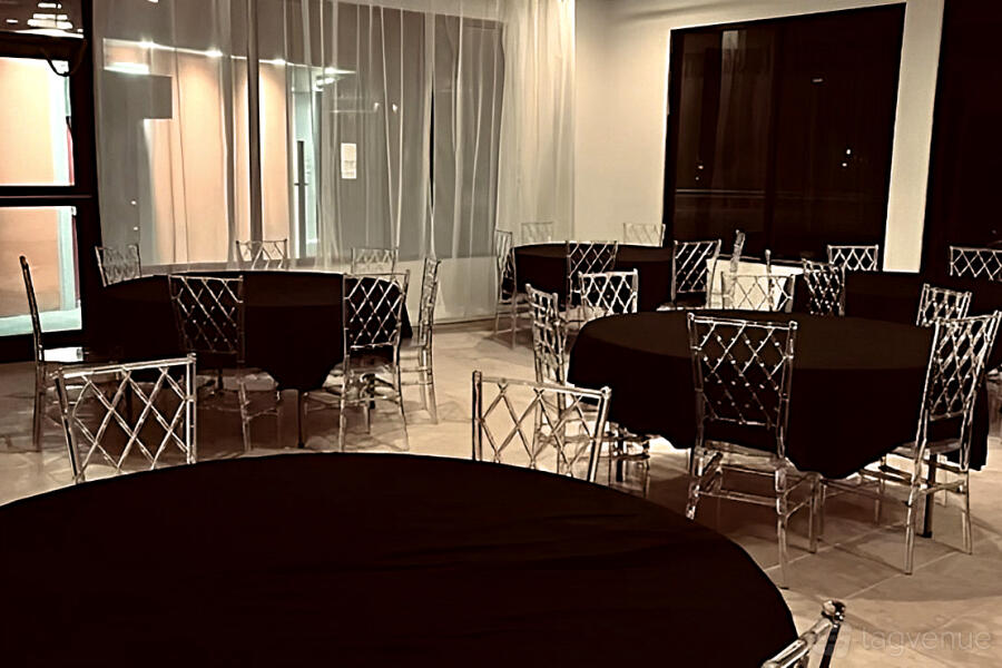 The Riviera Room provides standard amenities for every event, including 60-inch round tables and standard chairs. Guests can conveniently access on-site parking. A Bluetooth speaker and microphone are available for audio needs.