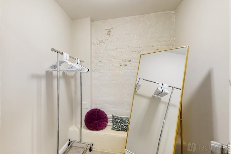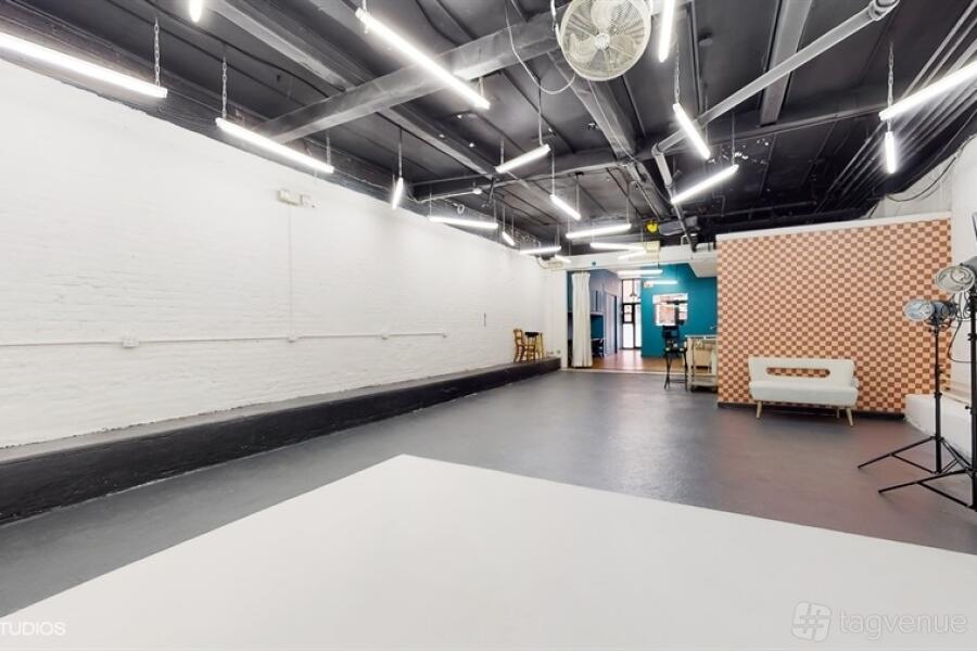 In the main studio room, there is a large bathroom, a changing room (with a 6ft rolling rack, a mirror, and a chair), space for an HMU station, and the cyclorama/infinity wall.