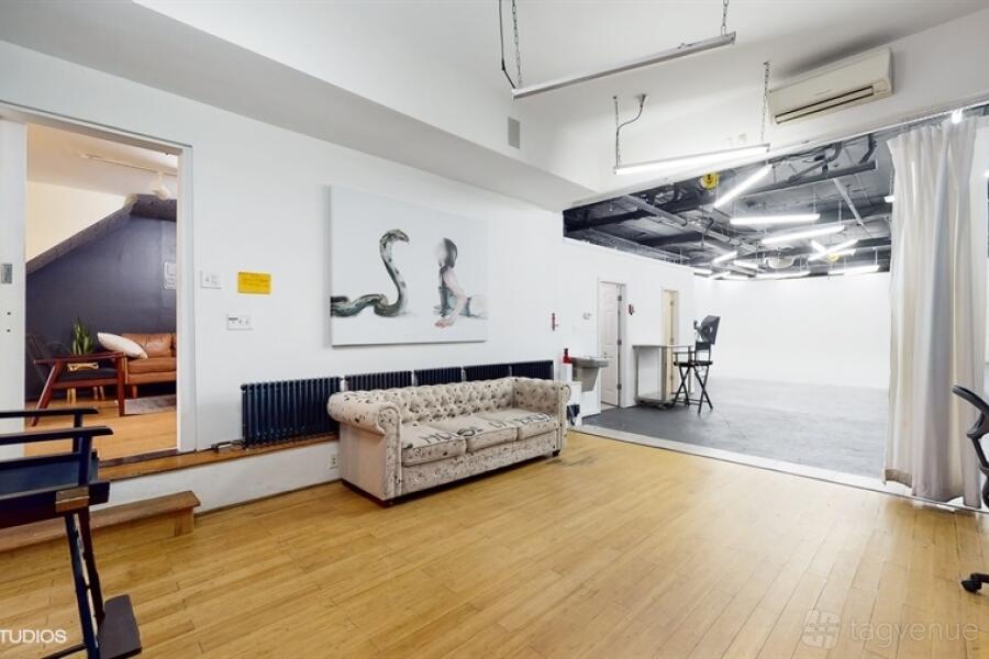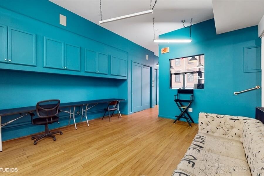 The next room is the green room, which is a large open space that can be used as a client area, video village, talent green room, production office, and more. This space has a curtain so it can be open or closed to the rest of the studio.