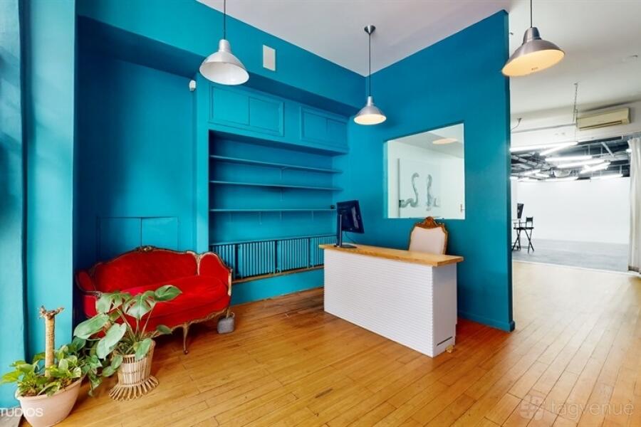 When you enter the space, you walk through our reception area which can be offered empty to be used as additional gear storage, talent holding, wardrobe, props, or catering. This space can be rented for an additional $200, otherwise, it will be set up in its default state with a reception desk.