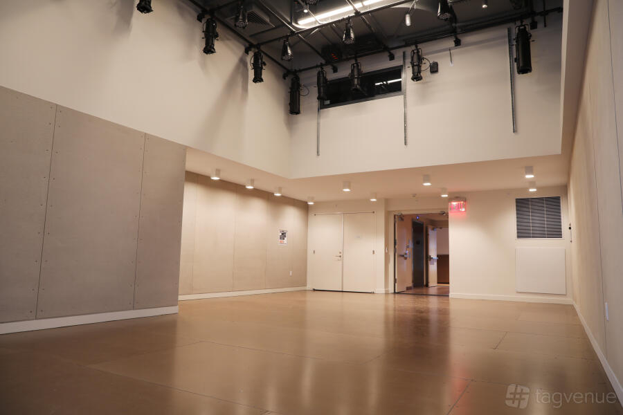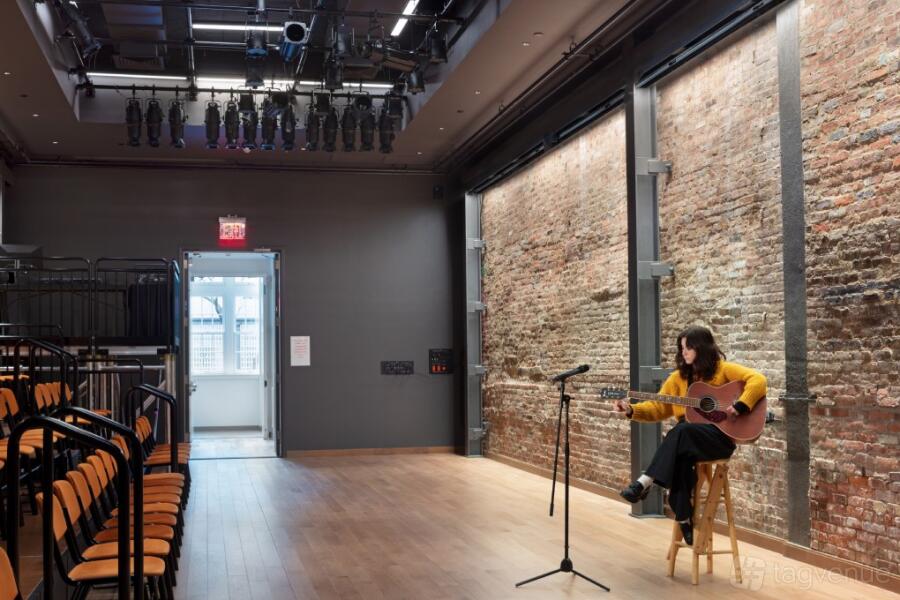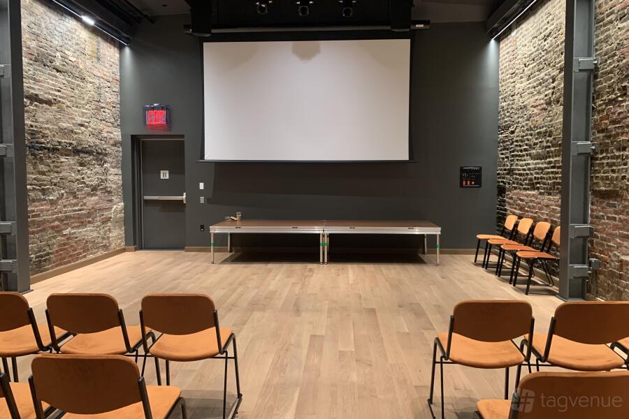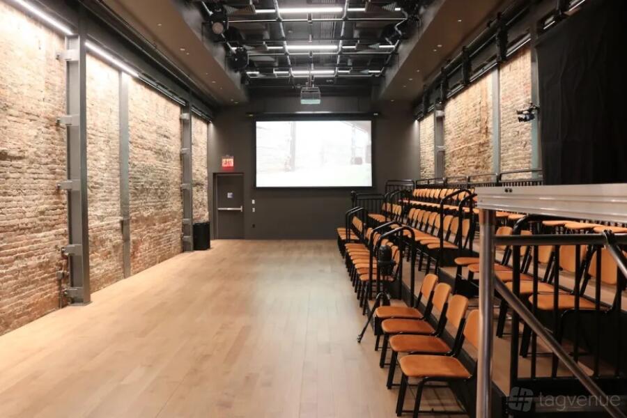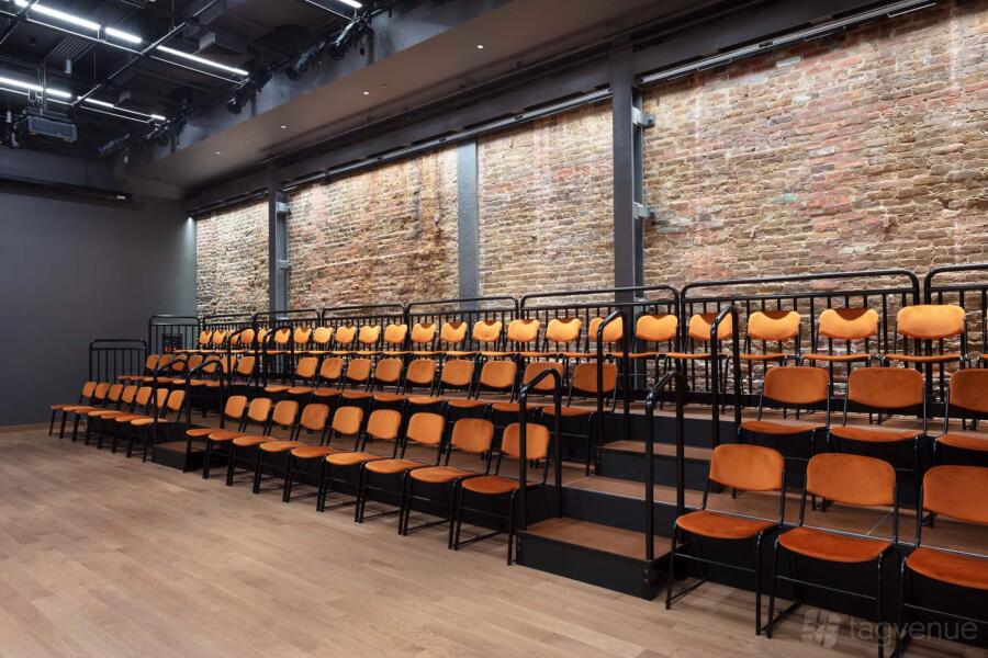 The second space is a theater featuring comfortable riser seats. This space offers a more traditional yet equally dynamic setting. The space boasts brick walls and adjustable seating arrangements allowing for creating a space where the audience feels truly immersed.