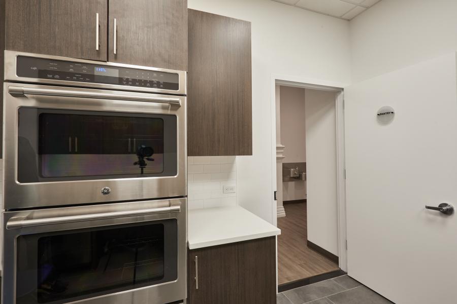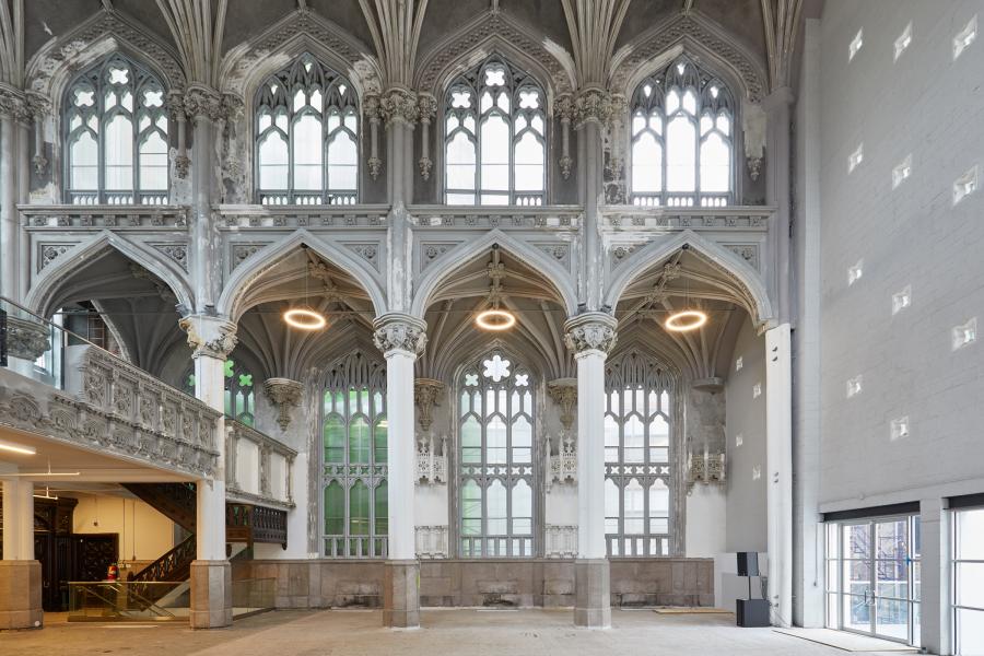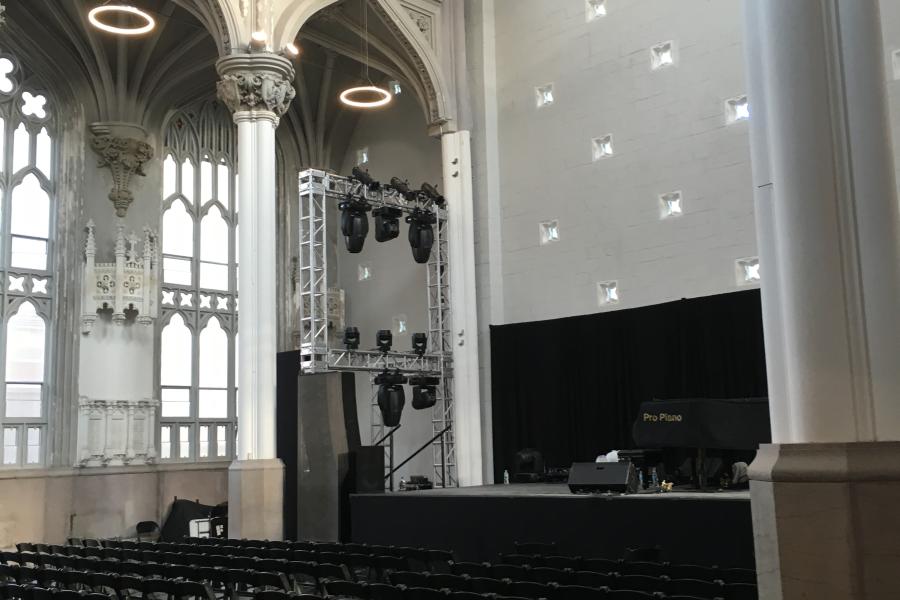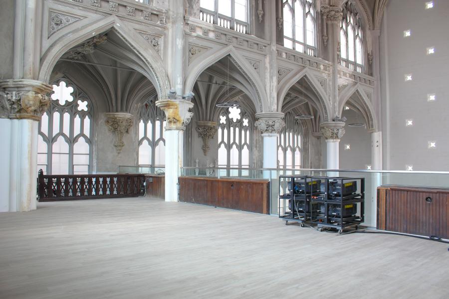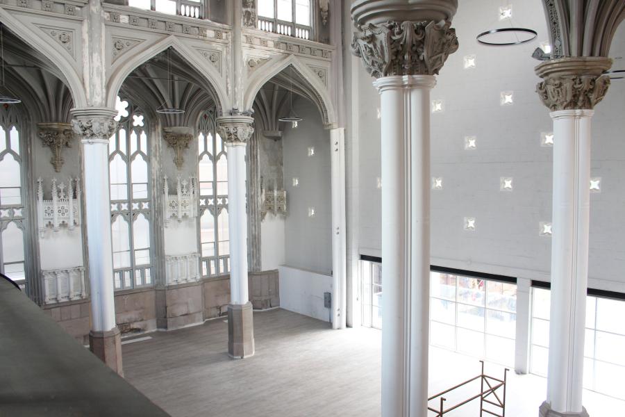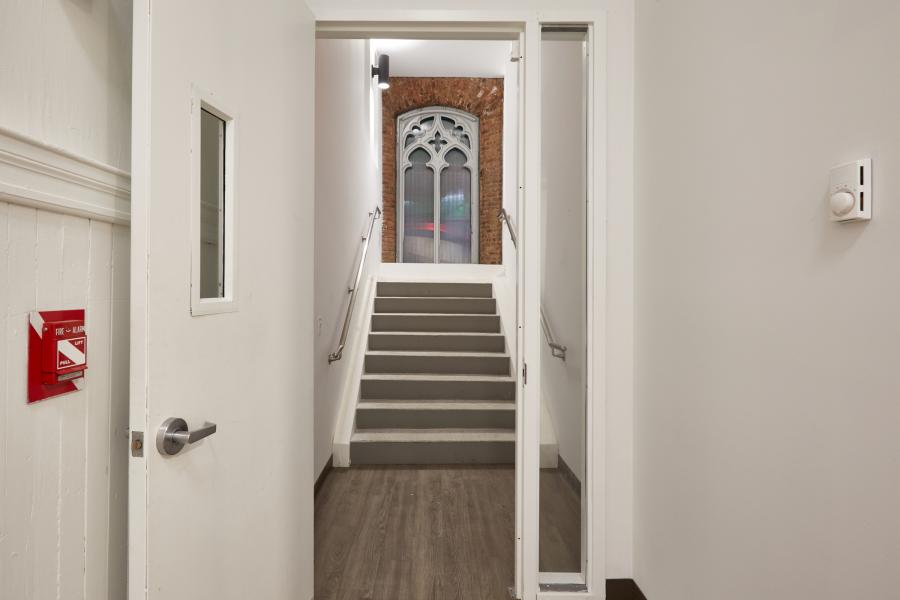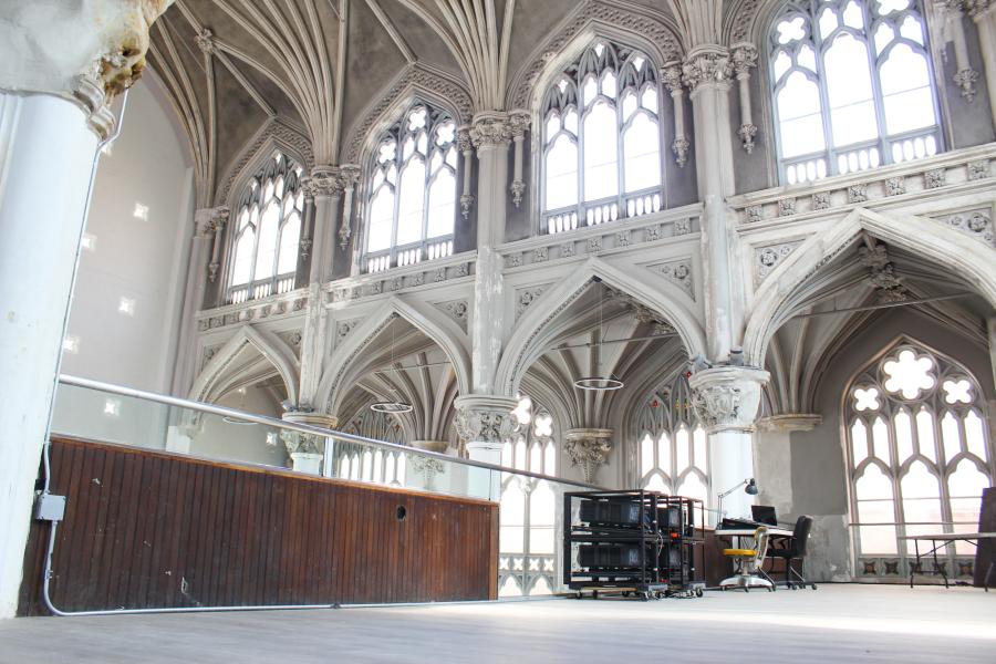 A former church, the space features neo-Gothic architectural details and German stained glass. The venue also has an outdoor terrace space, heating kitchen, included sound system, and a large custom-mapped projection system as an available add-on.