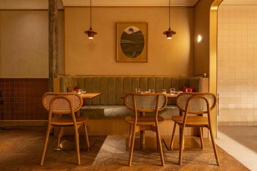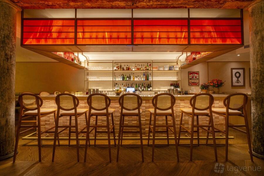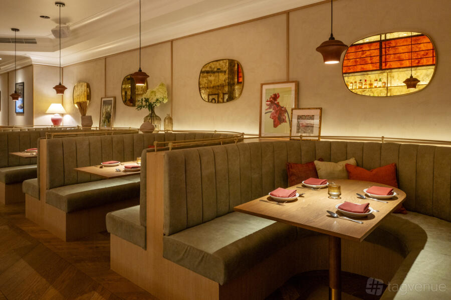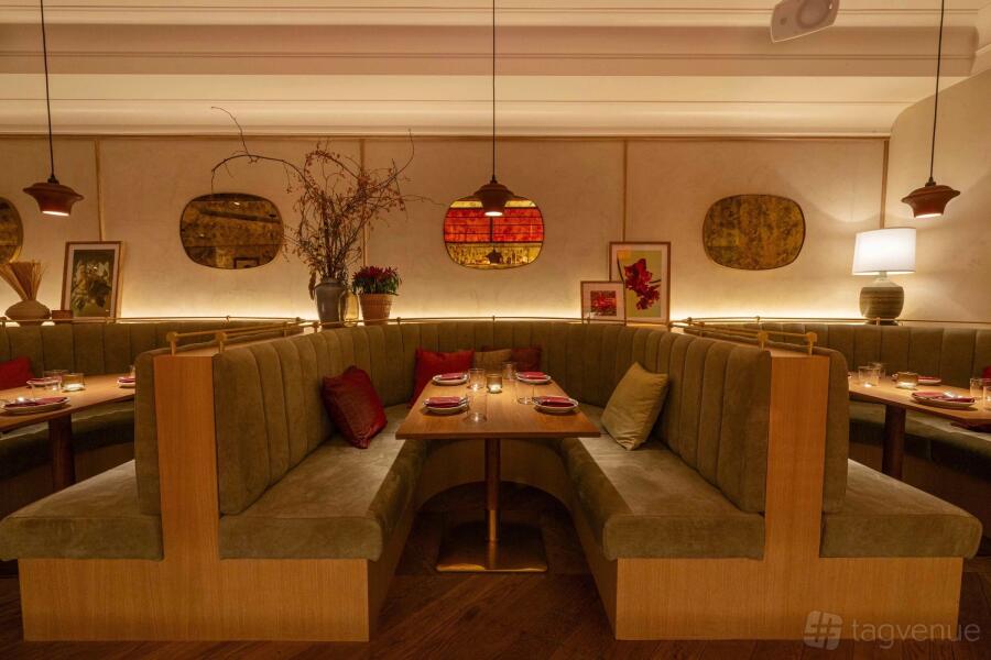 The space is thoughtfully divided into distinct zones, including a cozy dining area, a chic bar, and private booths for more secluded gatherings, each equipped with state-of-the-art sound systems that enhance the dining experience without overwhelming conversations.