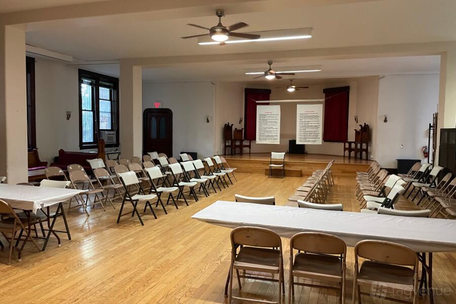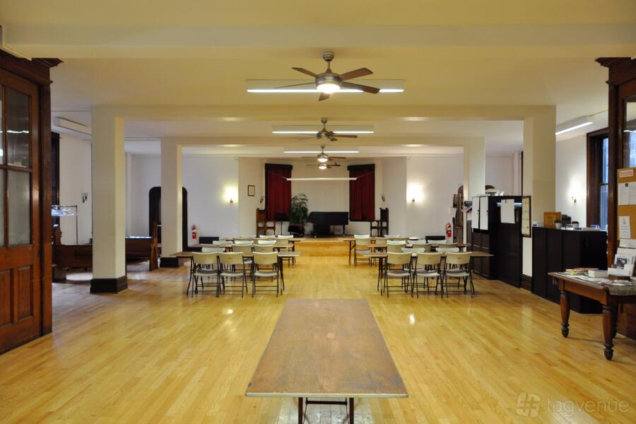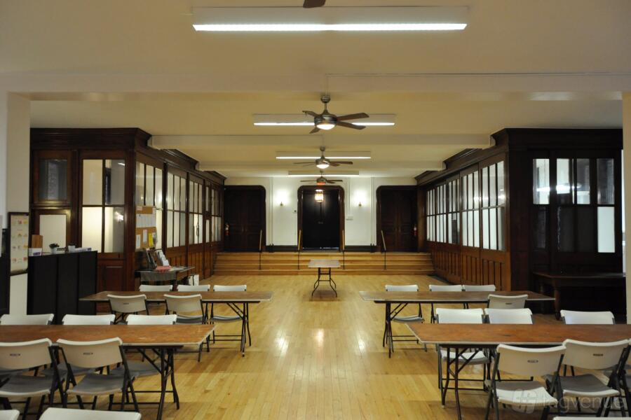 On the first floor of the church is the Community Hall, which you enter through a grand doorway. This big, bright room can hold up to 140 people for events and has wooden floors. It’s equipped with a projector and screen for different uses, and has a well-set-up kitchen for any catering needs.