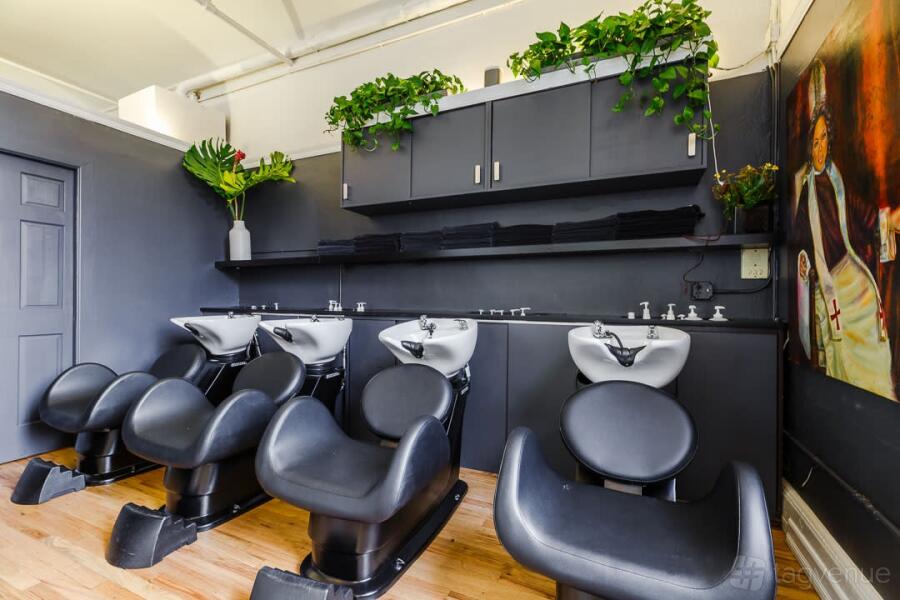 The salon features 8 hair stations, 4 shampoo bowls, a private room, a coat closet, a changing room, and a kitchenette with a mini fridge and microwave.