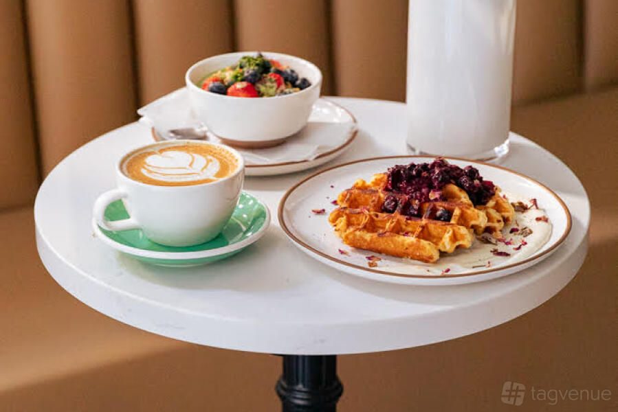 Enjoy specialty coffee, tea, and a selection of quality bites, with vegan and gluten-free options available. The space comfortably accommodates up to 45 seated guests and 60 for standing events.