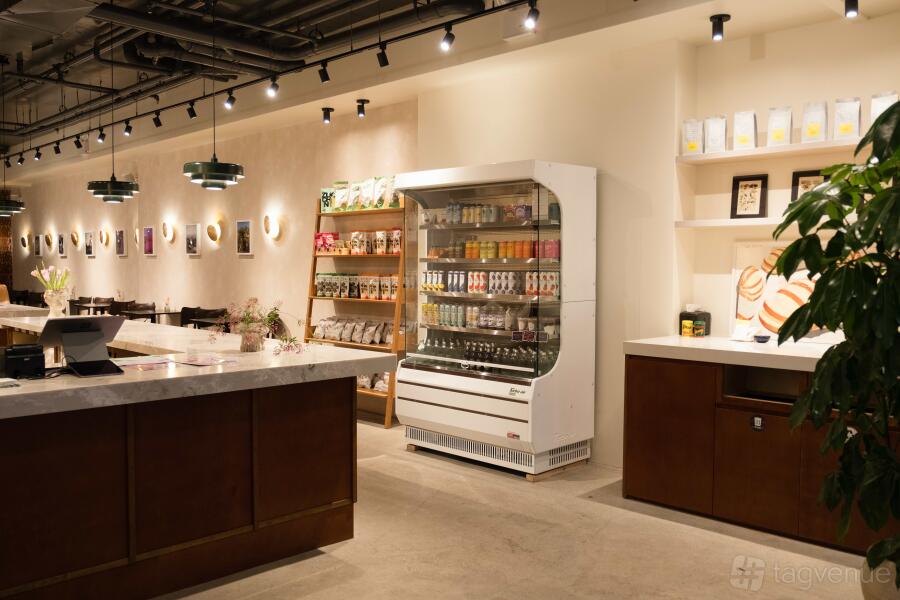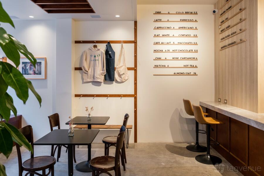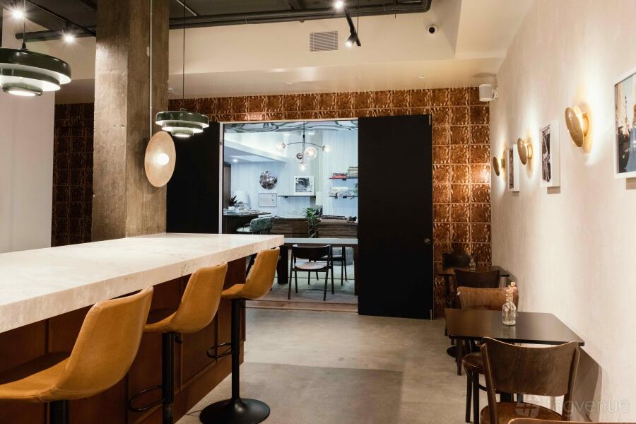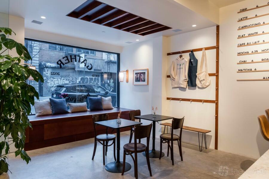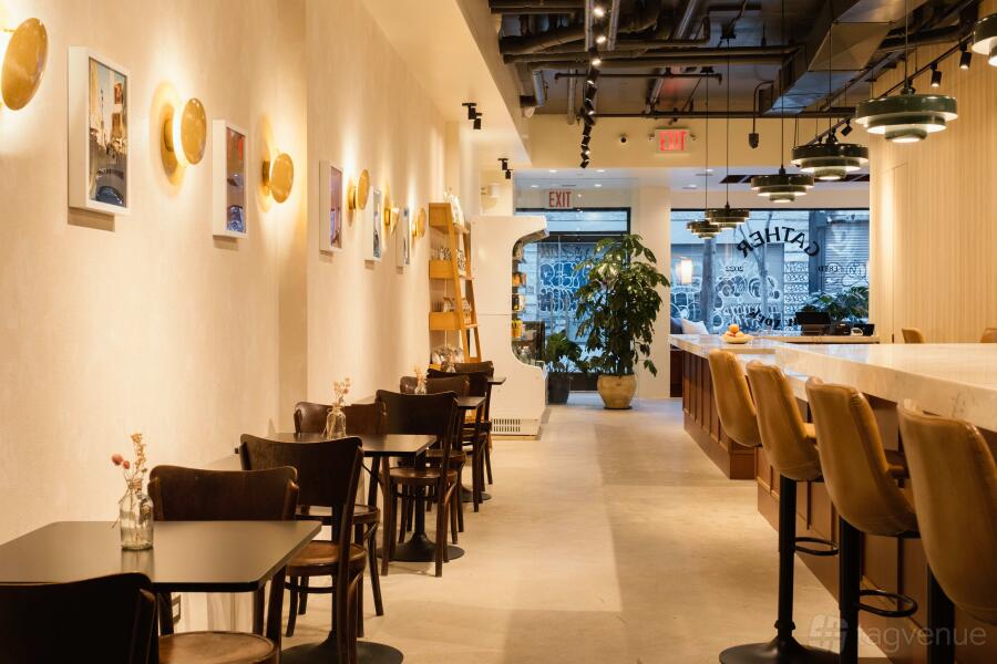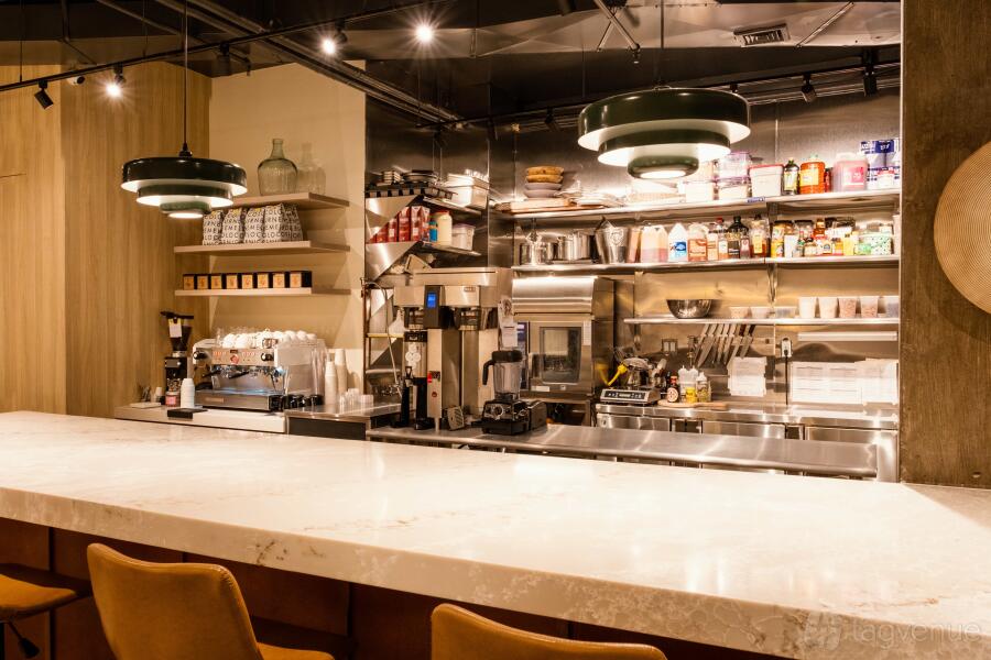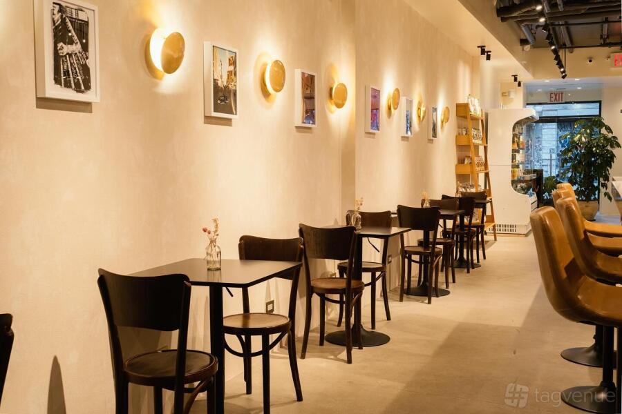 Amenities include a state-of-the-art Rational iCombi oven, premium coffee and beverage equipment, a high-quality sound system, and a stylish restroom. The venue accommodates up to 60 guests, featuring a sleek bar, a cozy window nook with plush seating, and tables perfect for small groups. It’s an ideal spot for casual gatherings, creative events, or private dining in the center of a dynamic community.