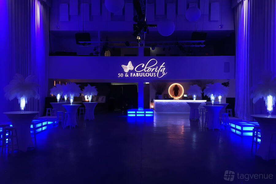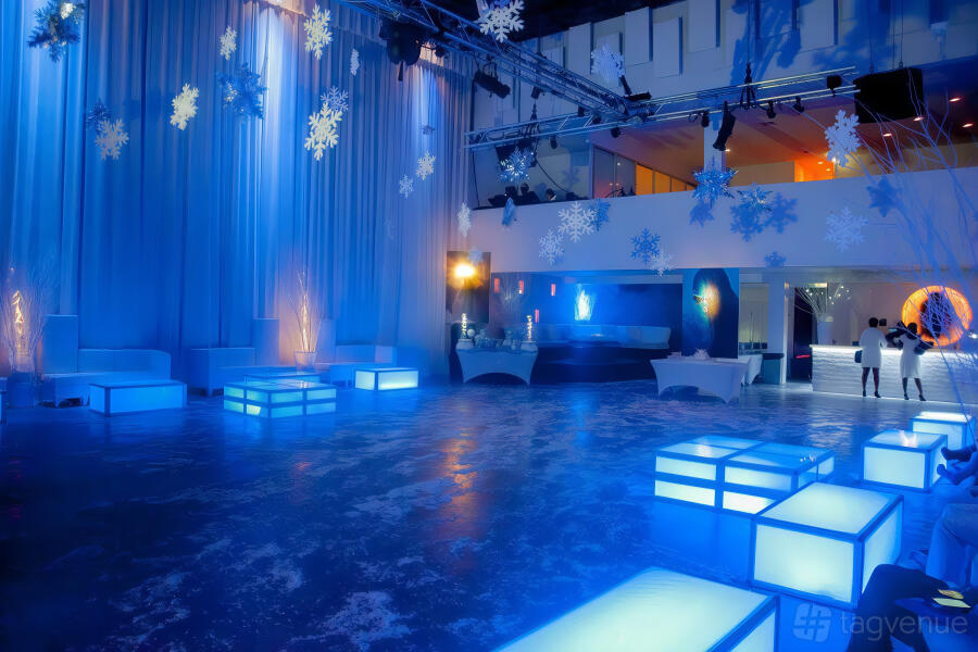 Our open floor plan with a mezzanine level has soaring 30 foot ceilings and is draped with white velour curtains offering a blank canvas that lends itself to any décor plan. Our space is visually appealing and customizable. We can personalize your exclusive event with our advanced color downlighting and amazing sound system. Whether you need a professional looking space, a magical wonderland or anything in between, we have the expertise to bring your vision to life.