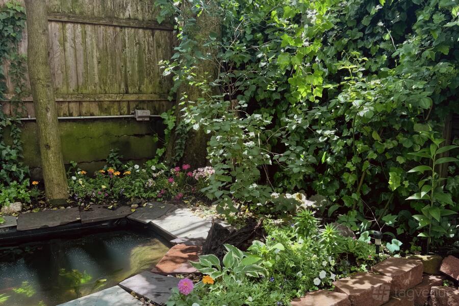 The downstair floor which has the living room, dining room space, a guest bedroom and a bathroom, kitchen and access to a beautiful garden. It is about 1100 square feet of living space plus the garden is about 700 square feet. The upstair level is our bedrooms and offices.