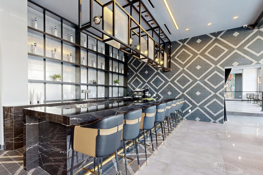 Its black and gold design, along with geometric patterns, adds an elegant touch. Large windows fill the space with natural light during the day, while a carefully designed lighting system sets a warm mood for evening events.