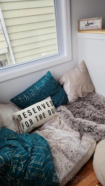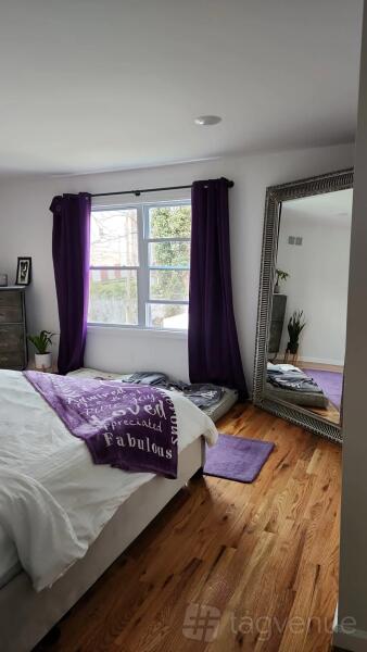 The second floor boasts a stylish master bedroom with a grey-purple theme and a master bath featuring black and white tiles with hip hop lyrics. This level also has a teenage girl’s bedroom in rosé and white, another bathroom with a yellow sunflower design, and a living area with a small office nook and a doggy space, all bathed in natural light.