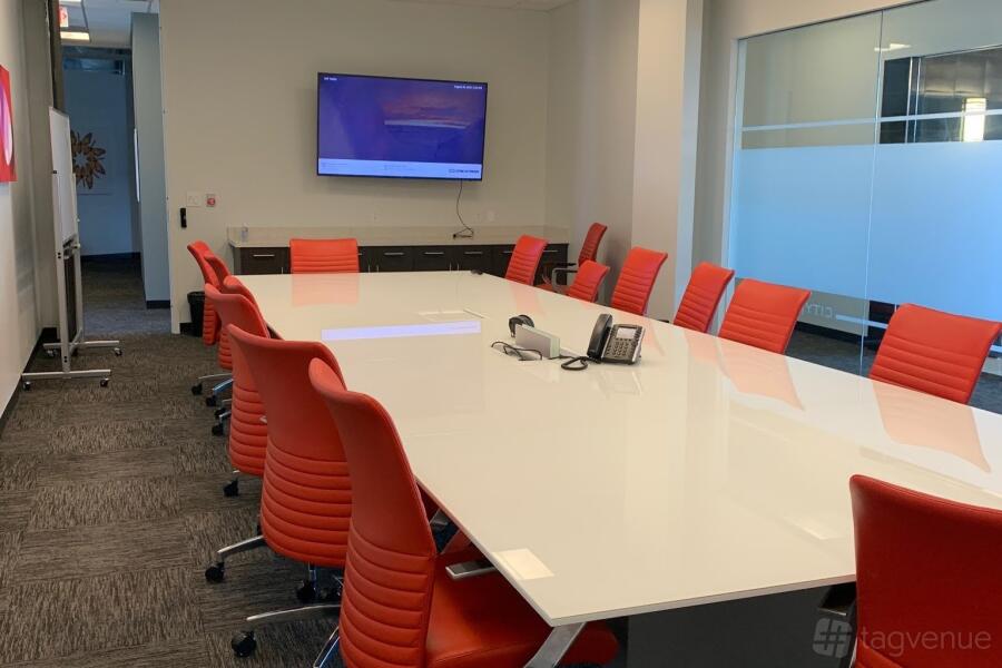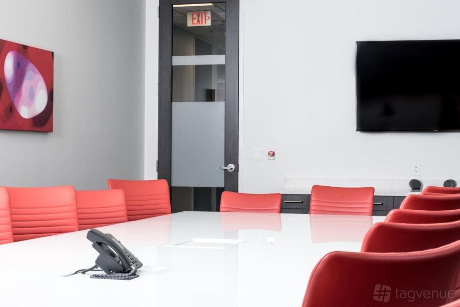 The Executive Boardroom combines sophistication and functionality, featuring a clean and modern design that is ideal for high-level meetings and presentations. This room is decked out with plush red seating that adds a vibrant touch against the minimalist white conference table, creating a dynamic yet professional atmosphere. The space is equippe...