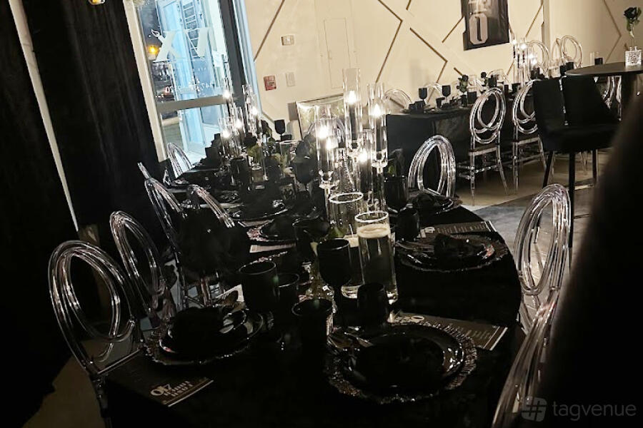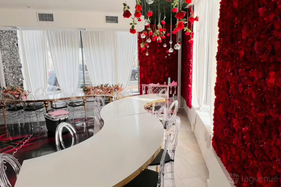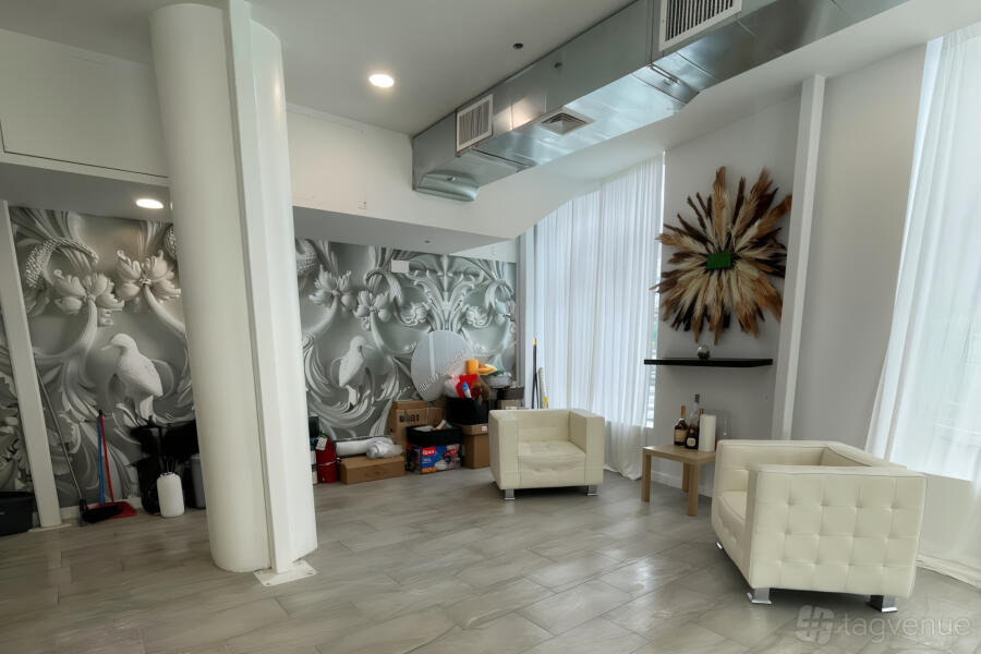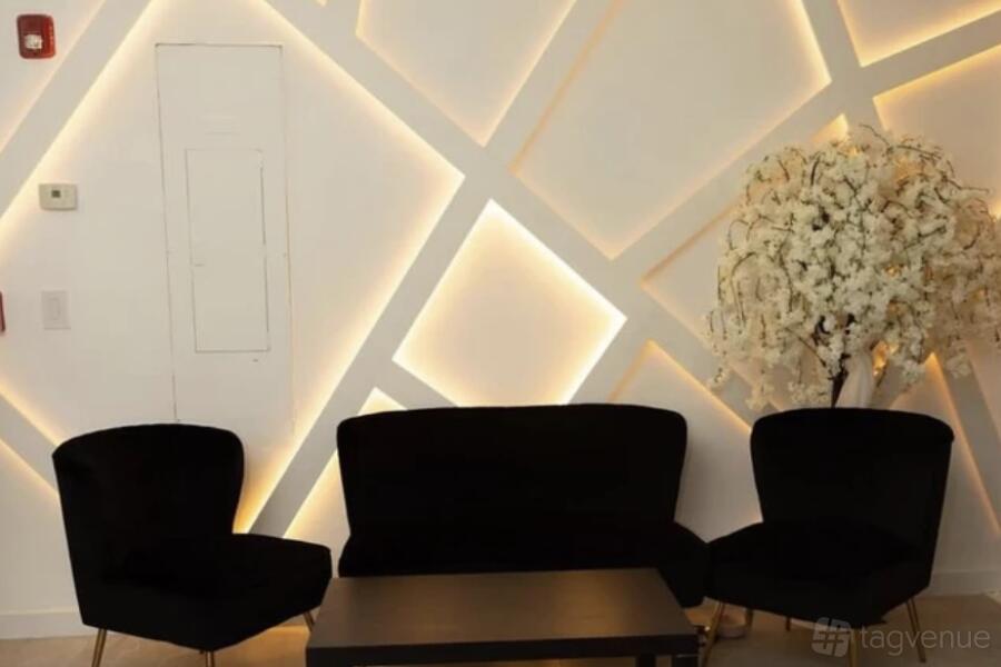 An open floor plan offers flexibility for various setups, with large windows providing plenty of natural light. The stylish atmosphere makes it ideal for creating memorable experiences. Additionally, a cozy lounge area offers a spot for guests to relax and mingle.