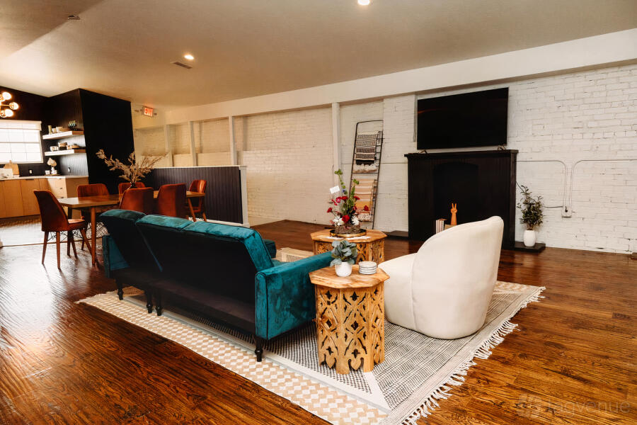 The second floor houses a fully furnished 1,300 sq ft apartment, perfect for lifestyle shoots, complete with a kitchen, bath, king-size bed, and living area.