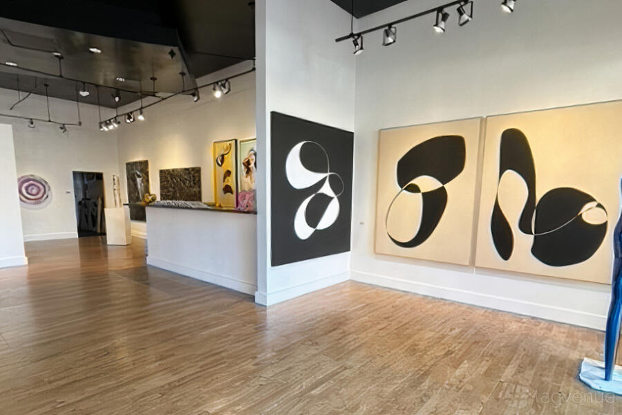 Ceiling lights delicately illuminate the space, ensuring that each artwork is showcased in its full glory. The gallery embraces the beauty of simplicity, allowing the art to take center stage in an environment that is both inviting and inspiring.