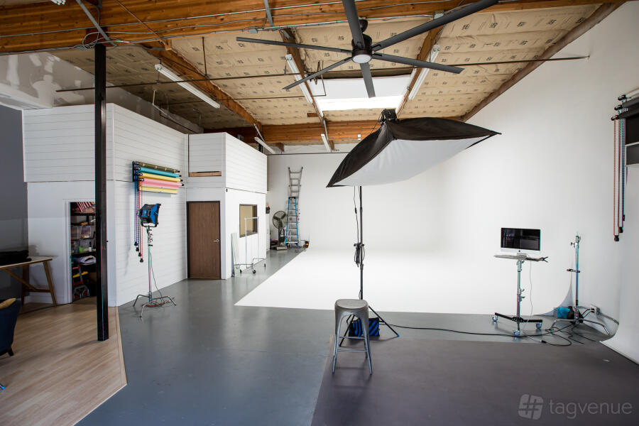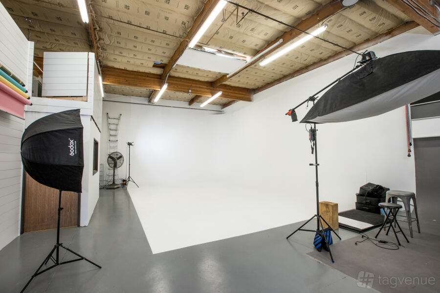 Skylight Studios is the largest cyclorama studio in central San Diego, ideal for photo and video shoots. Features include a 20x30' white cyc, 12x12' gray cyc, paper backdrops, natural light from a skylight and roll-up door, plus blackout curtains for full light control. Includes grip, air conditioning, makeup vanity, and easy load-in with free park...
