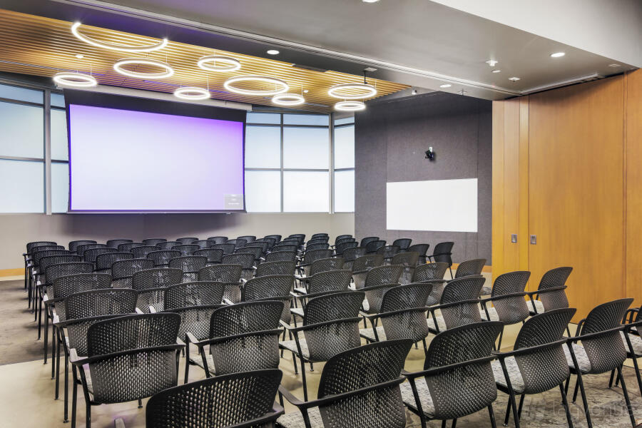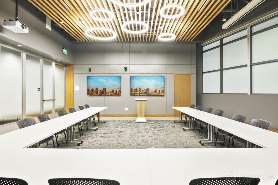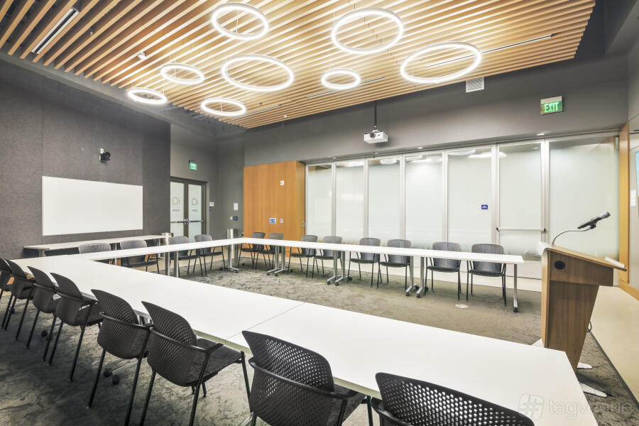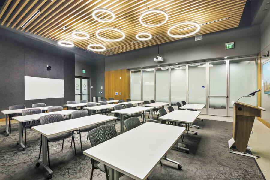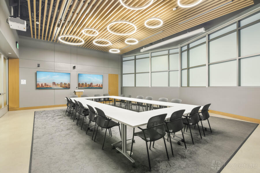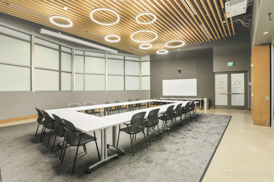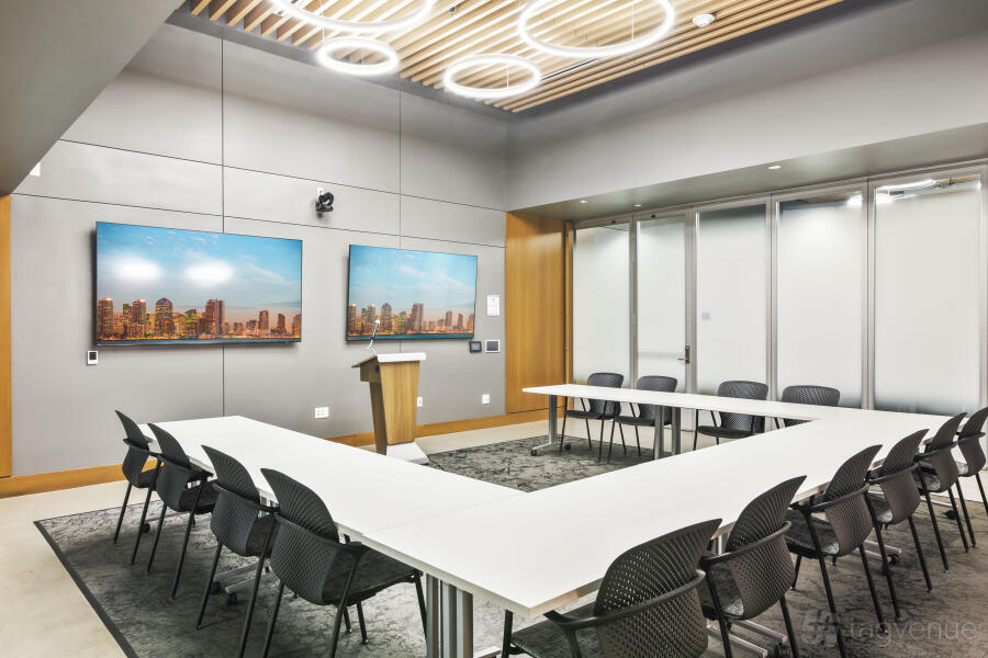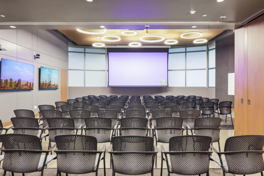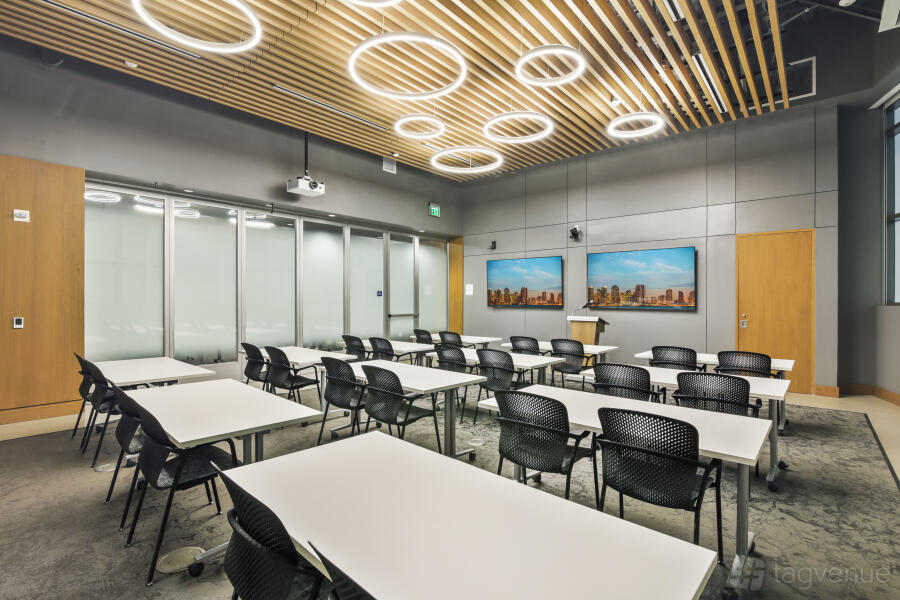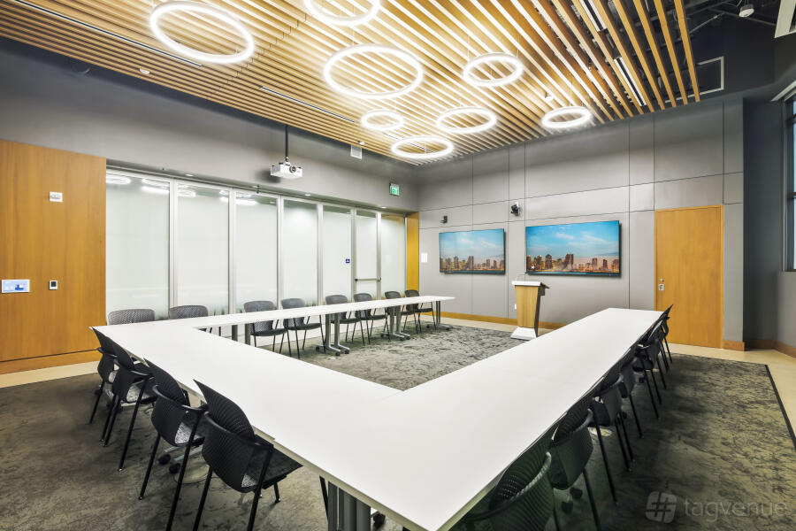 It features two dynamic boardrooms that can be combined to adapt to your needs, whether you're hosting a strategy session or a large-scale seminar, and it comes with four 86" displays with wireless casting & HDMI connectivity, a 184" projector screen (Edison-only or combined Edison/Tesla use), BYOD videoconferencing with PTZ camera, ceiling speakers & wall control panels, wireless microphones, whiteboards, tables, chairs, and a custom directional signage for a personalized guest experience.