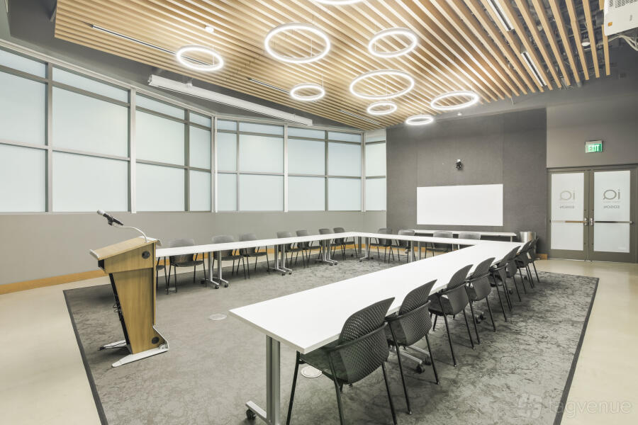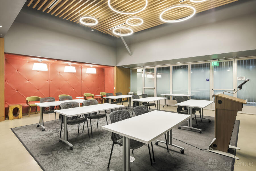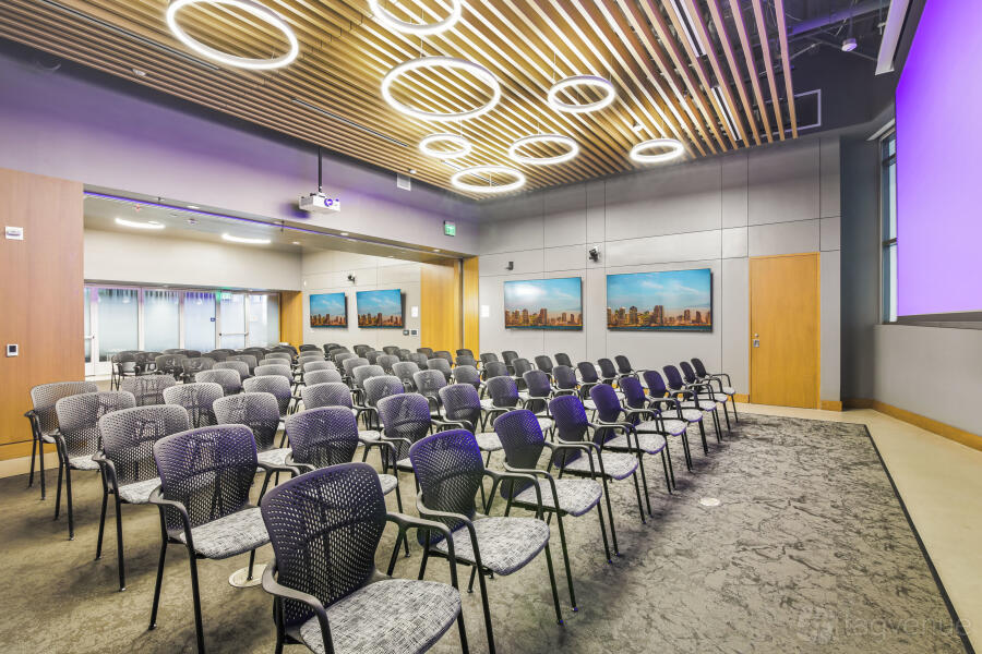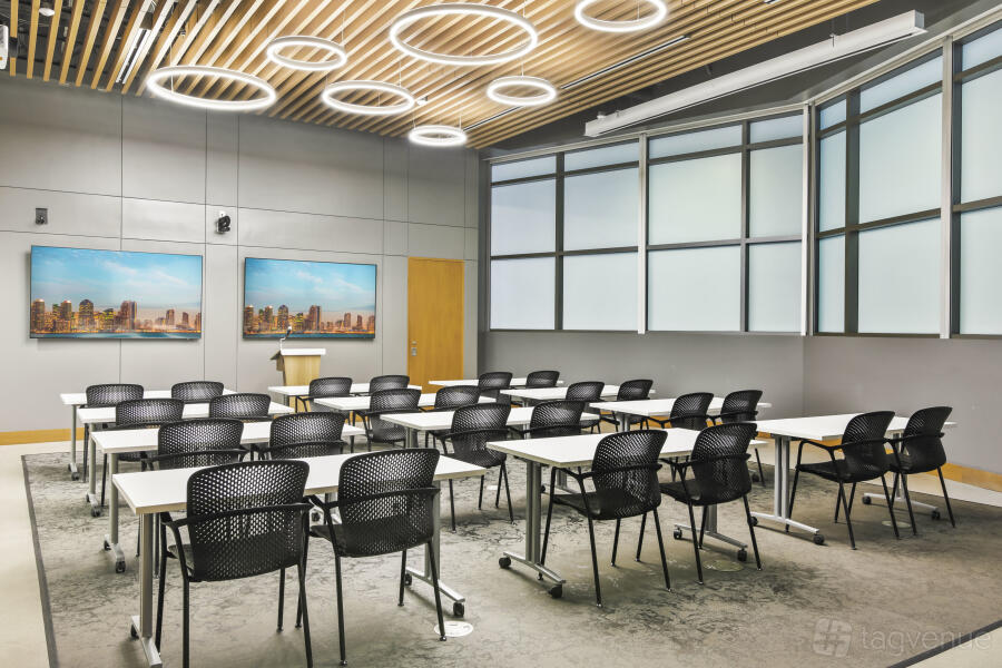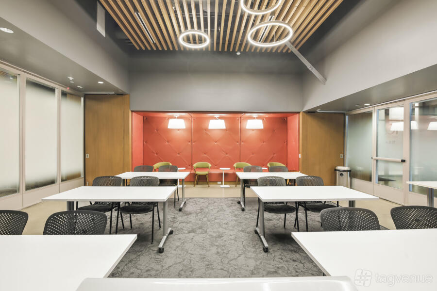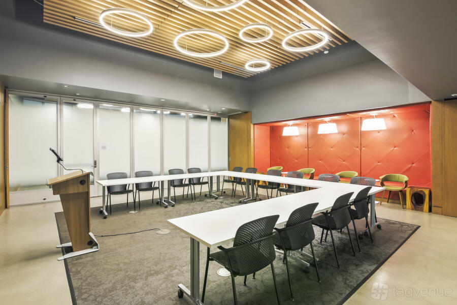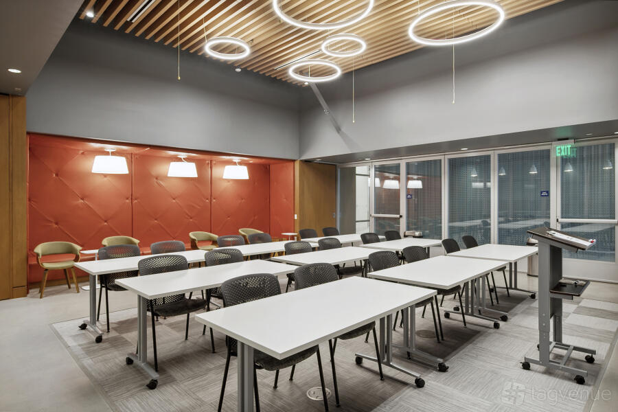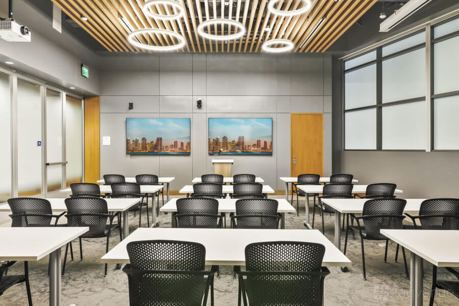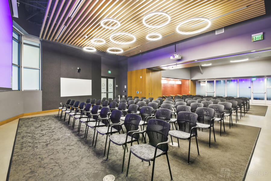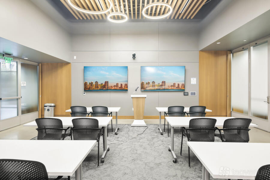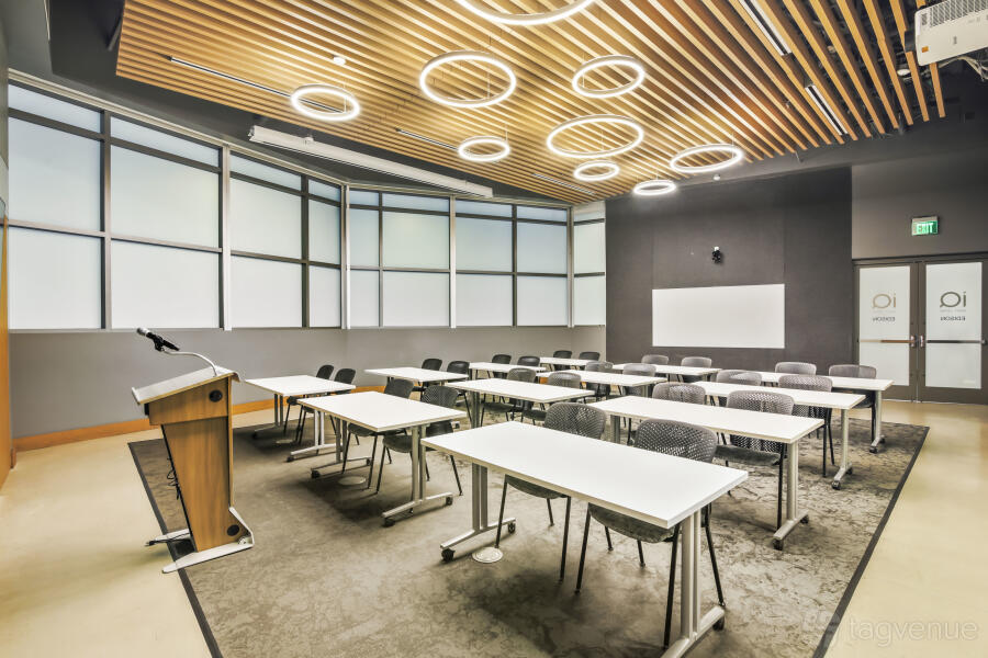 It features two dynamic boardrooms that can be combined to adapt to your needs, whether you're hosting a strategy session or a large-scale seminar, and it comes with four 86" displays with wireless casting & HDMI connectivity, a 184" projector screen (Edison-only or combined Edison/Tesla use), BYOD videoconferencing with PTZ camera, ceiling speakers & wall control panels, wireless microphones, whiteboards, tables, chairs, and a custom directional signage for a personalized guest experience.