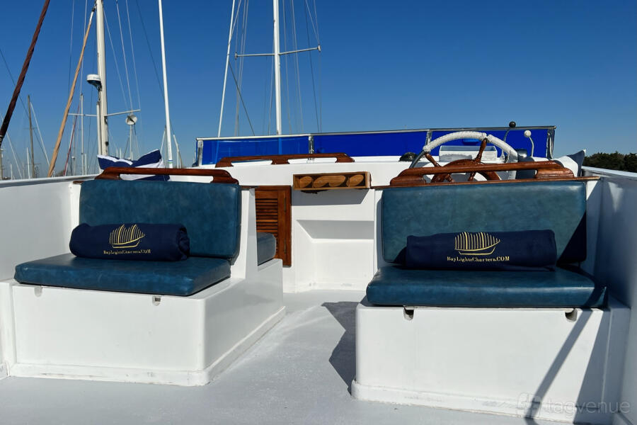She is ideal for smaller groups to go experience the San Francisco Bay as she is quite stable and has 360-degree views. Guests can escape the elements inside while not sacrificing their views of the Bay.