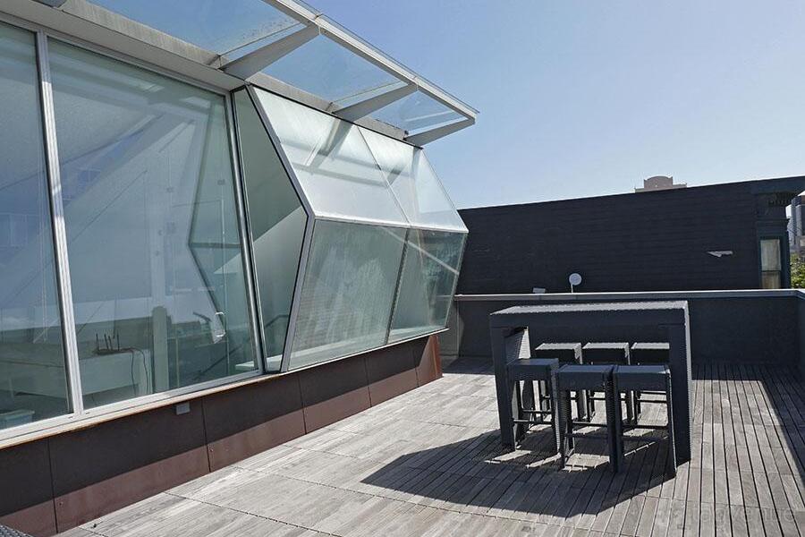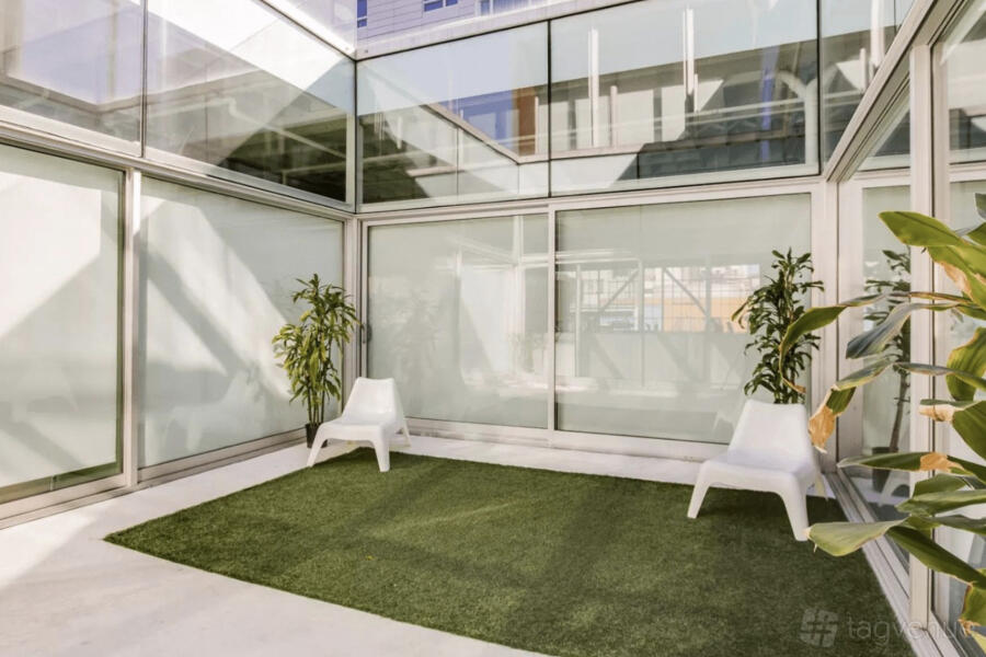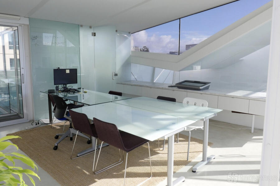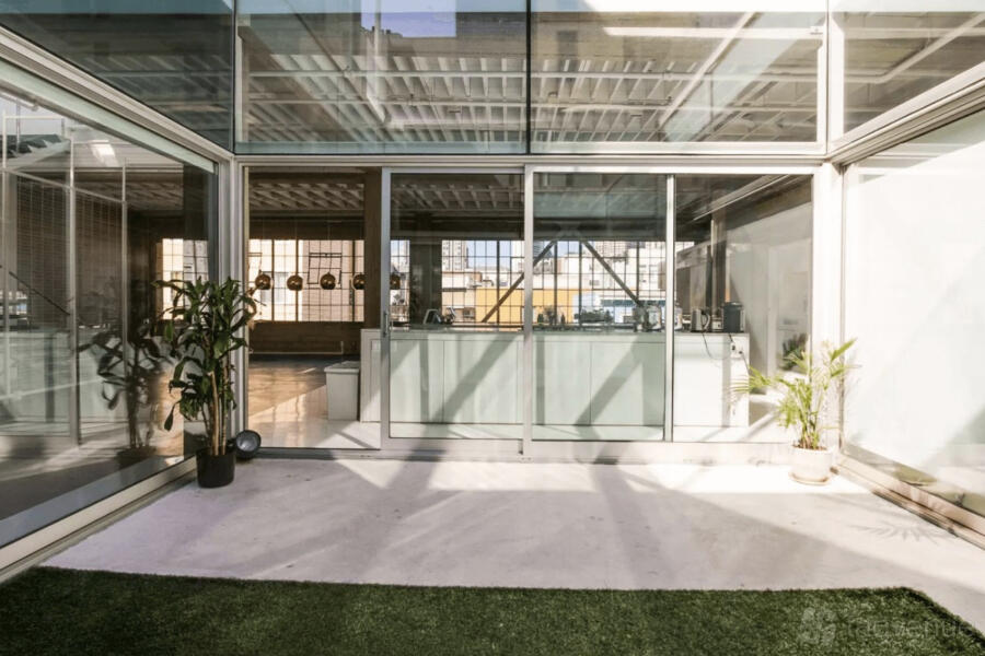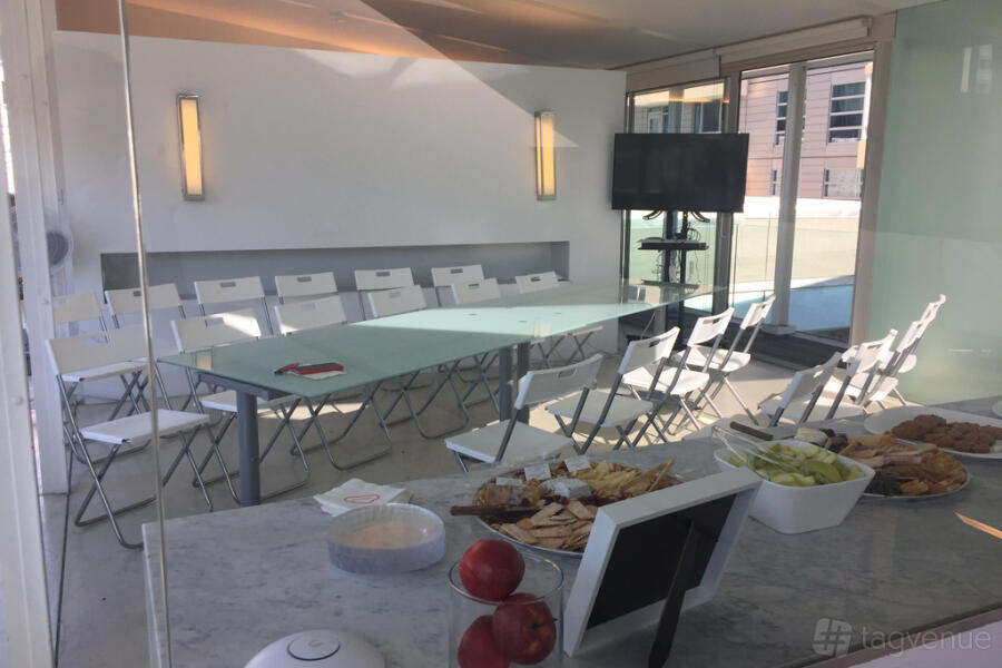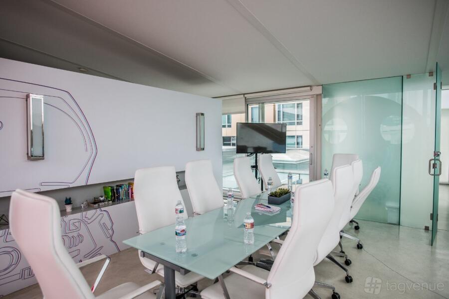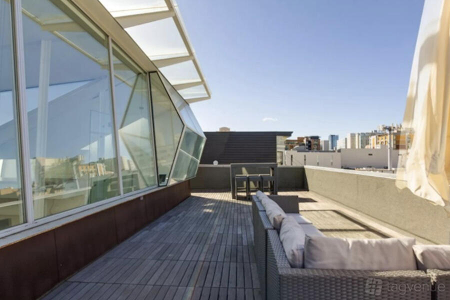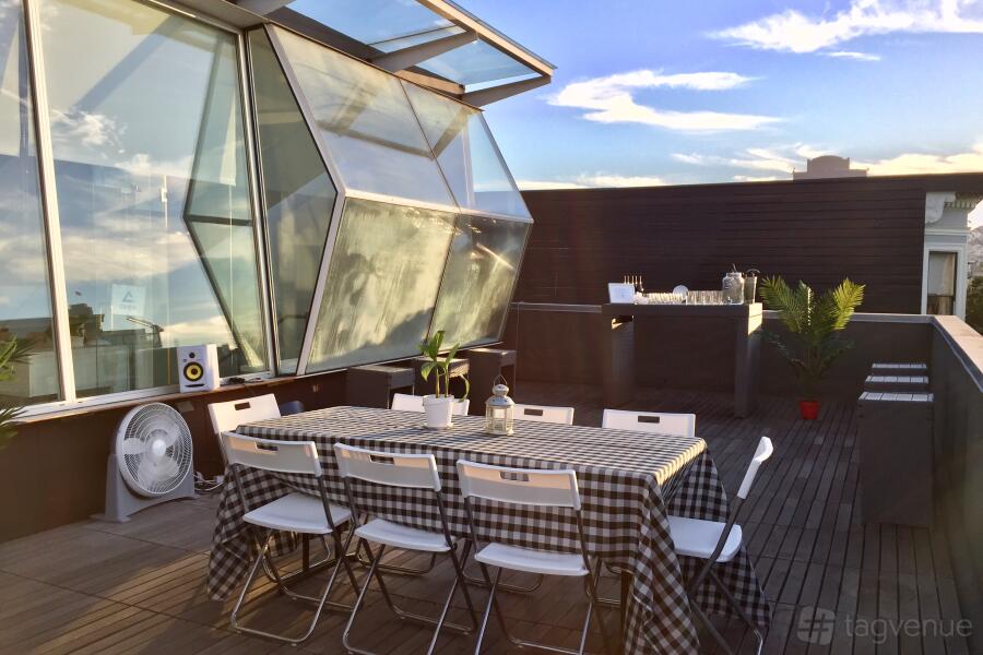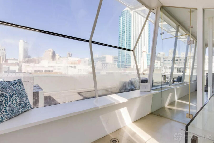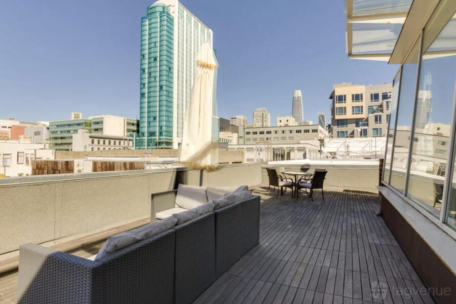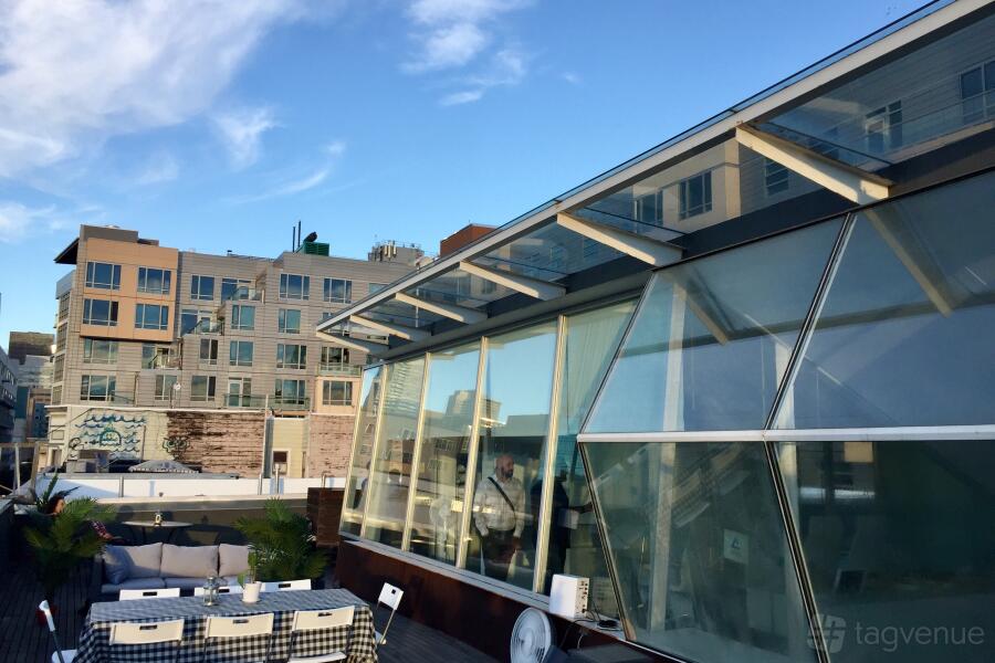 The space has three floors, including a rooftop patio, bathrooms on each floor, breakaway rooms, a full kitchen, and courtyard access. Angled glass walls and windows give the penthouse an open-air feel, topped only by the wood deck adorned with modern patio furniture.