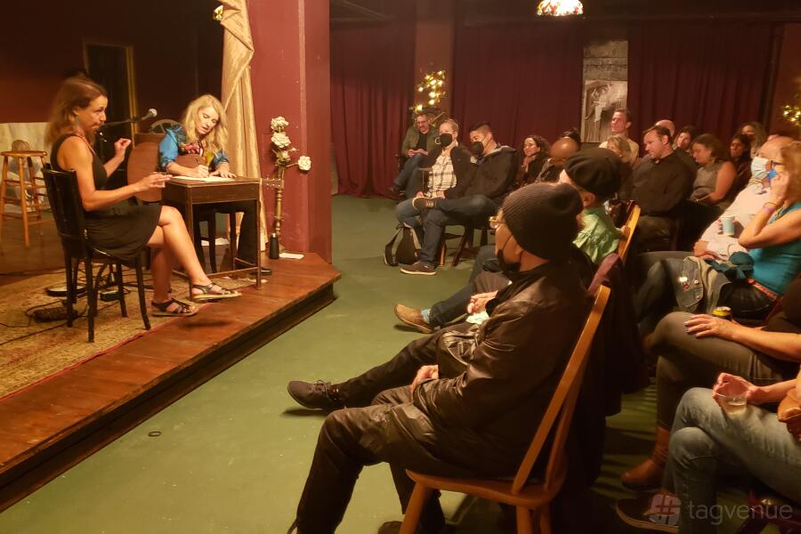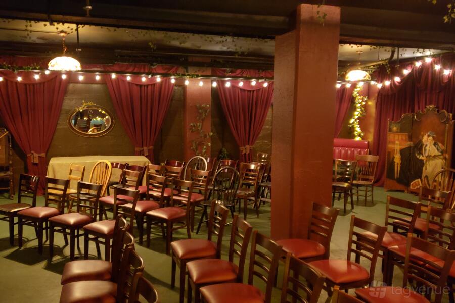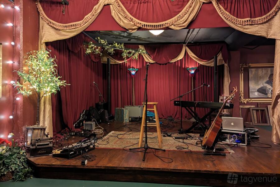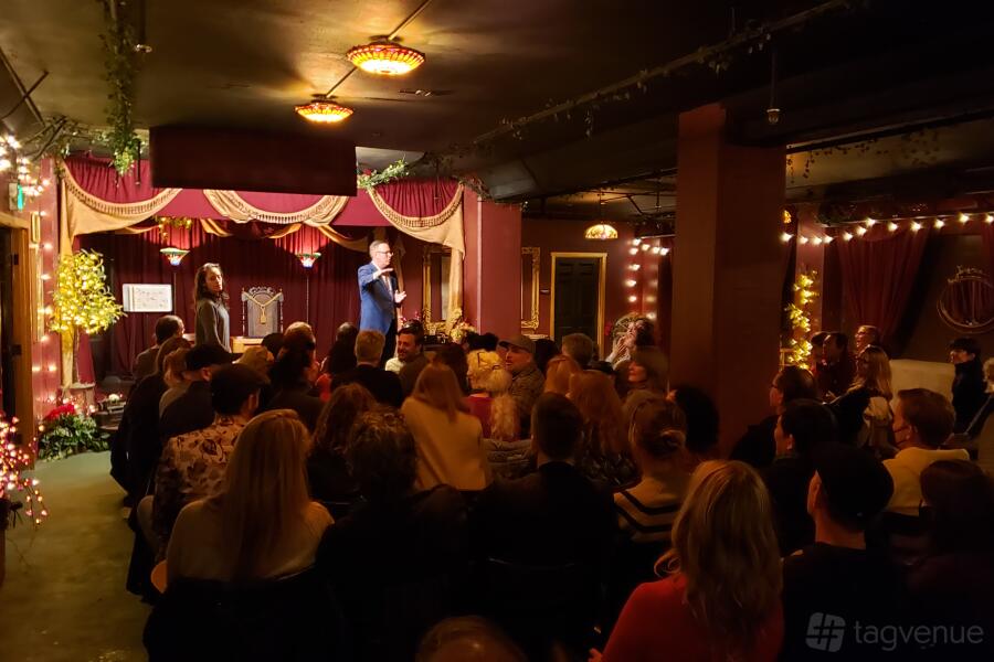 This space is a dark and utterly charming multi-media performance space featuring red velvet curtains, a stage, a low-lit speakeasy-style barroom, and a cool mix of a fresh attitude paired with a classic theater vibe.