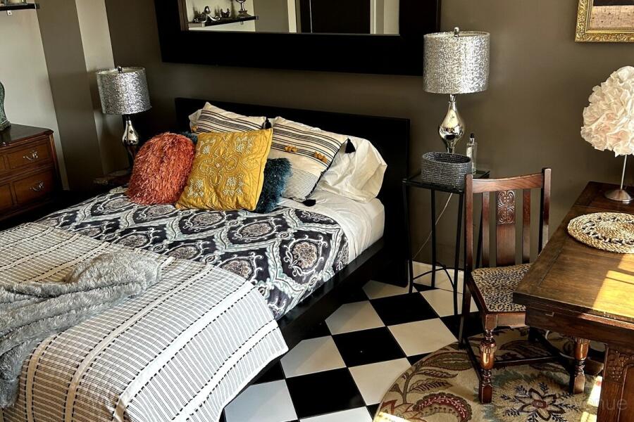 This studio apartment features bold black-and-white checkered floors, vibrant decor, and a cozy bed with a small desk area. The fully equipped kitchen offers sleek wooden cabinets and stainless steel appliances. The private balcony, adorned with lush plants, provides a perfect spot for relaxation.