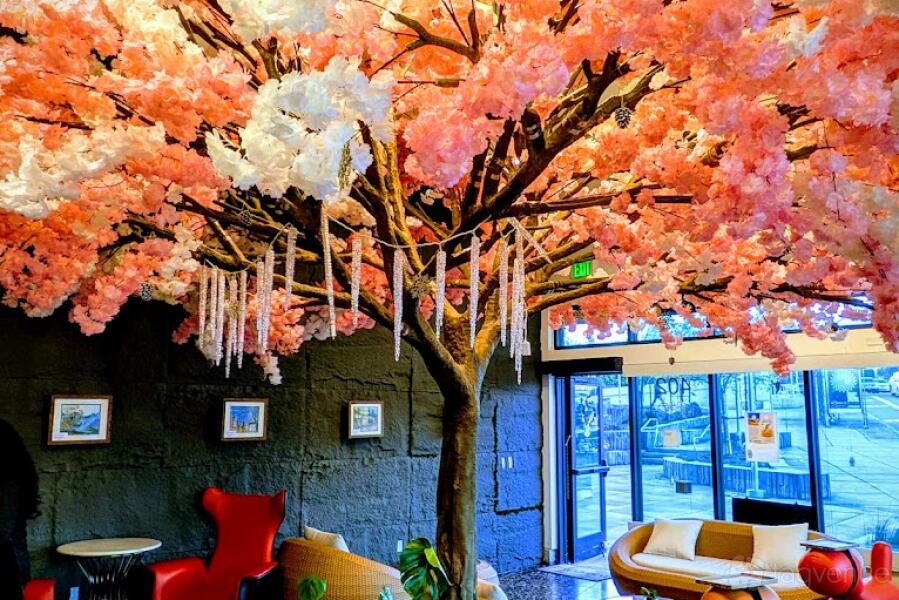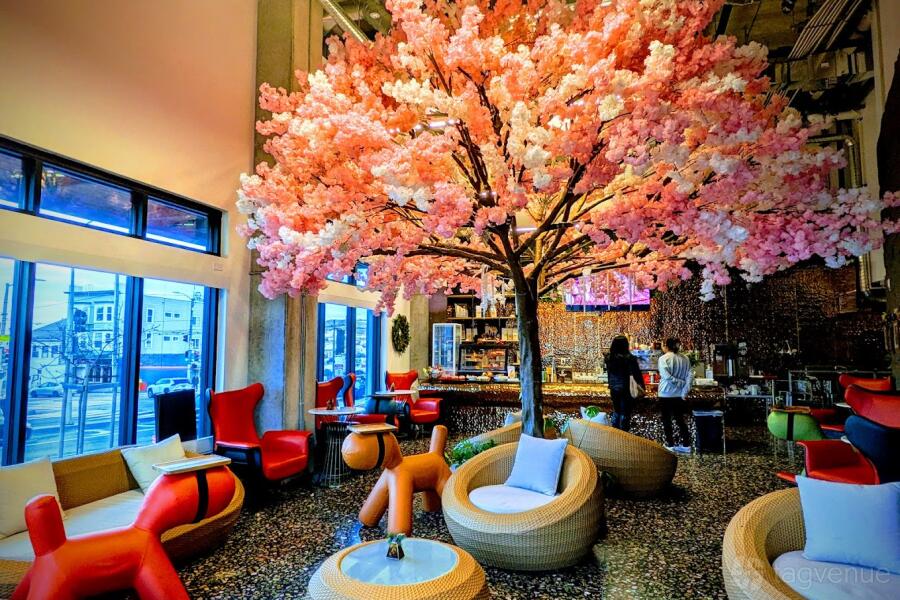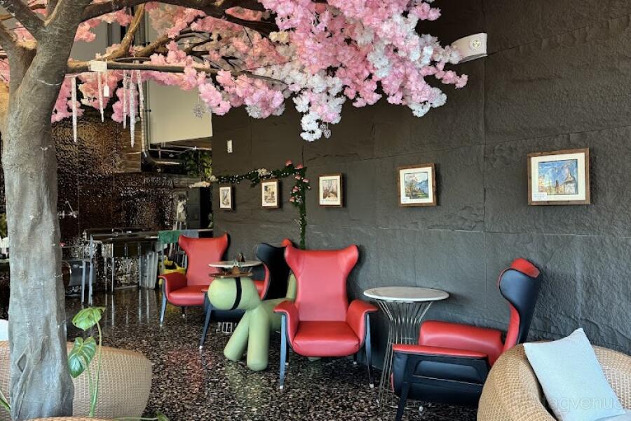 The interior features couches and tables. There is also a cherry blossom tree in the center. It is suitable for meetings over coffee with friends, and organising corporate receptions.