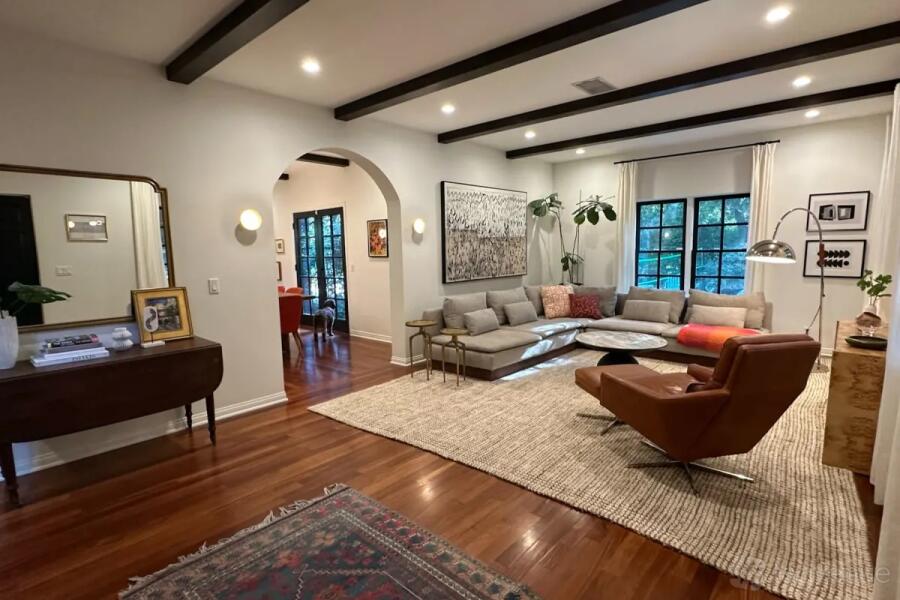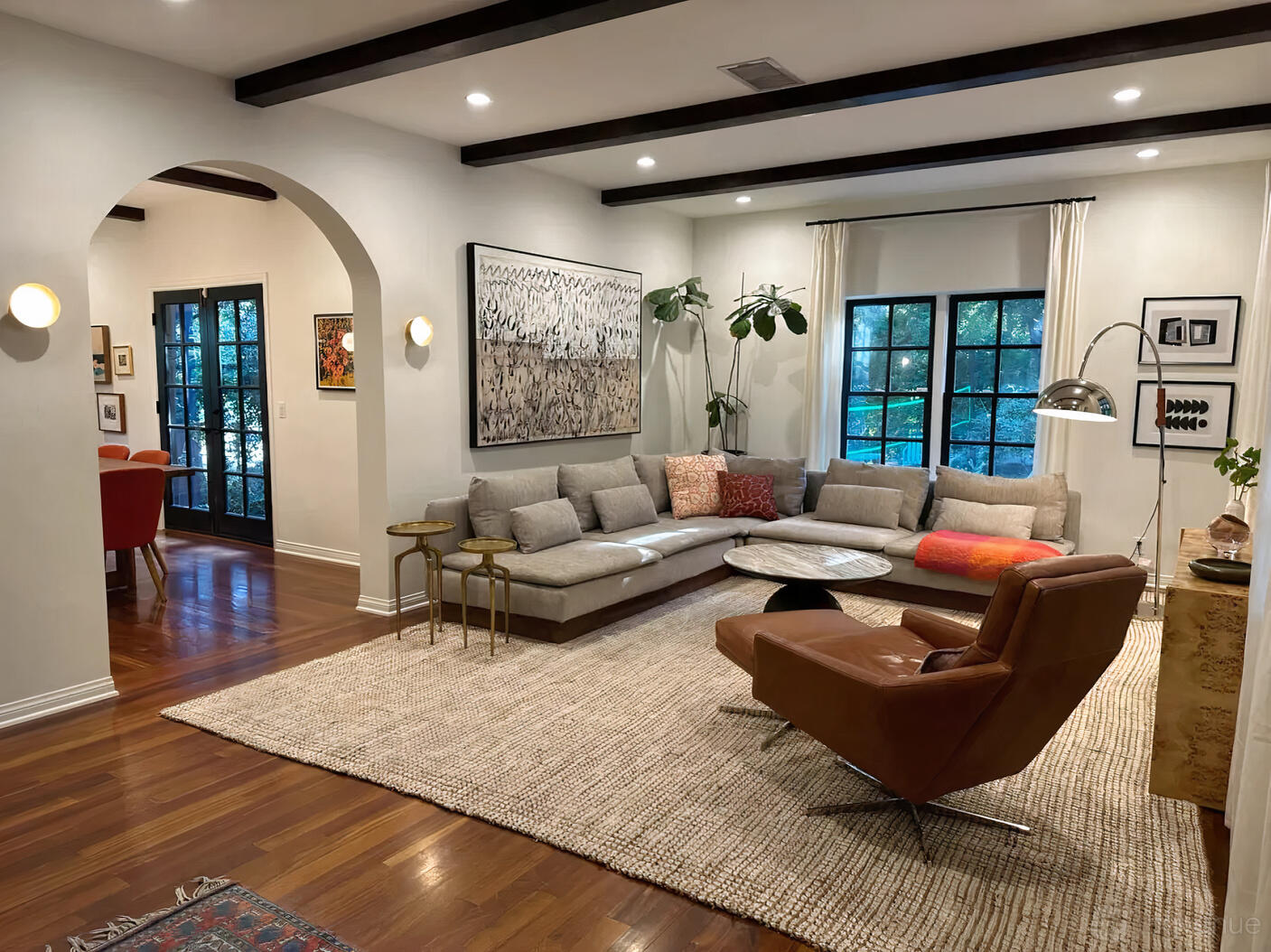 The main level includes a grand living room, an updated gourmet kitchen with high-end appliances, and a family room with a fireplace and Saltillo tile flooring. The dining room is adjacent to the kitchen, and there's also a full bathroom and an office on this floor.