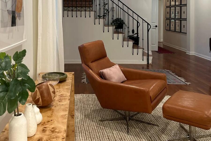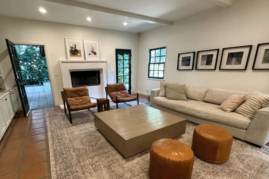 Upstairs, the primary suite includes a fireplace and a spa-like bathroom, alongside two additional bedrooms, an office, and a full bathroom. A screening room with a built-in projector adds a luxurious touch. The backyard is a tranquil retreat with a spacious patio and a built-in Viking BBQ, perfect for outdoor entertaining.