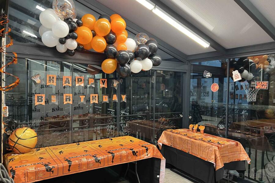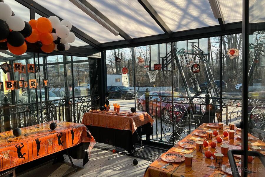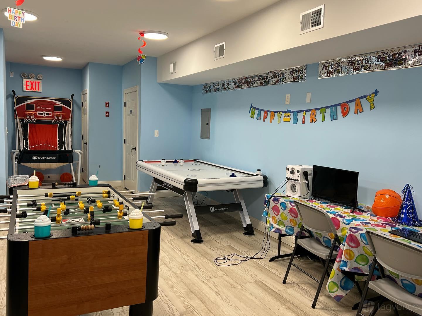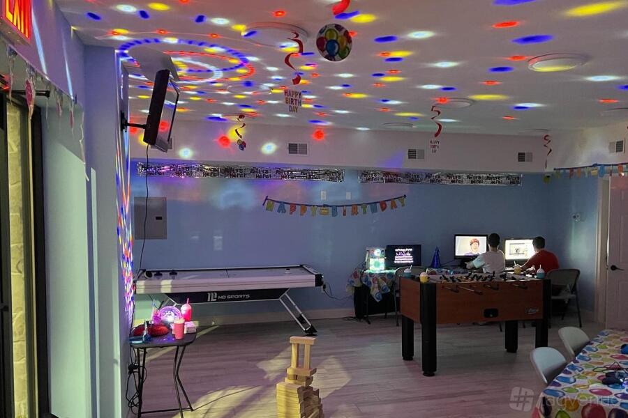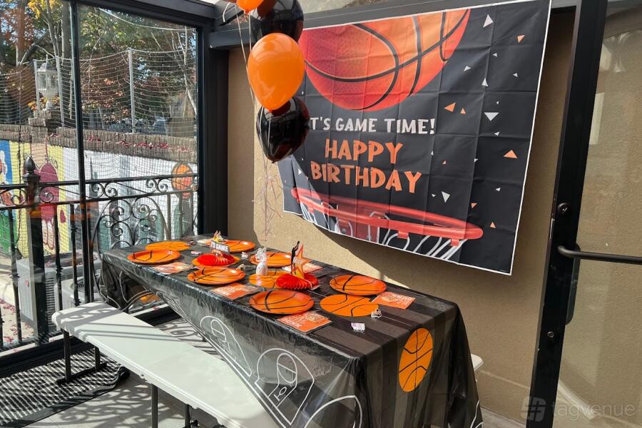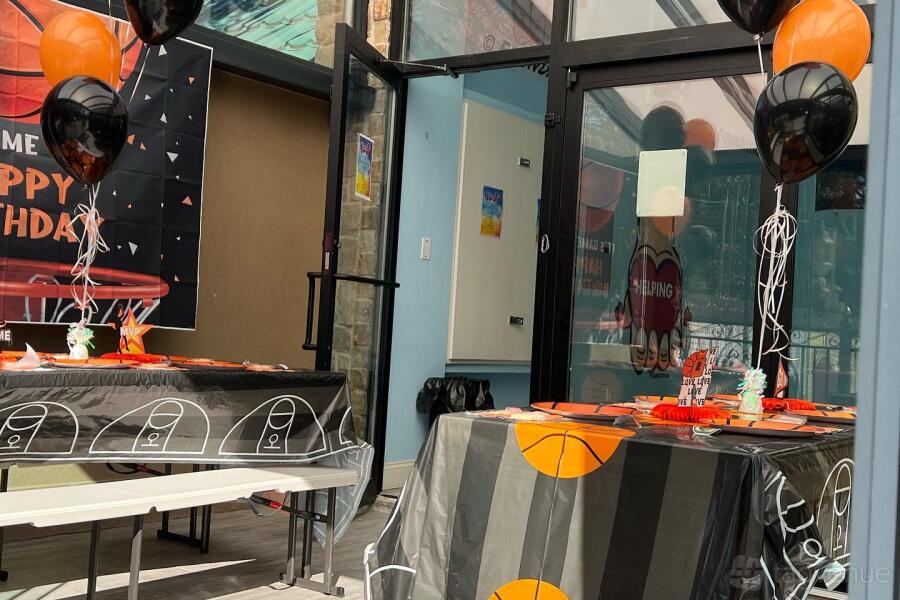 The venue is packed with amenities to keep young guests entertained, including foosball and air hockey tables, multiple gaming screens, and a sound system to set the party vibe. This main entertainment room is designed to be adaptable, allowing parents to create themed parties with ease. Outside, a fully enclosed area lets in plenty of natural light, adding an indoor-outdoor feel to the party space. It’s perfect for sports-themed decor or custom setups, bringing a fresh, open element to the venue.