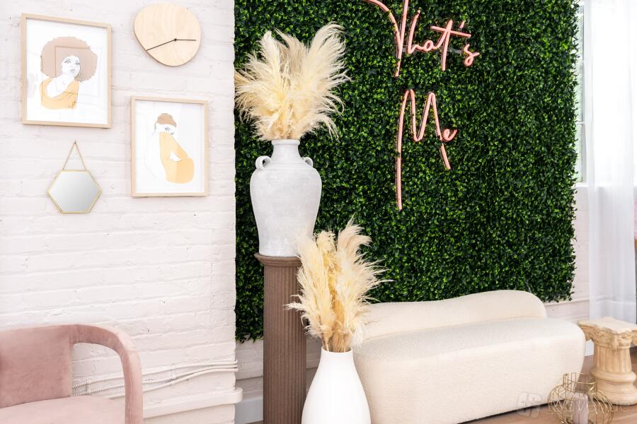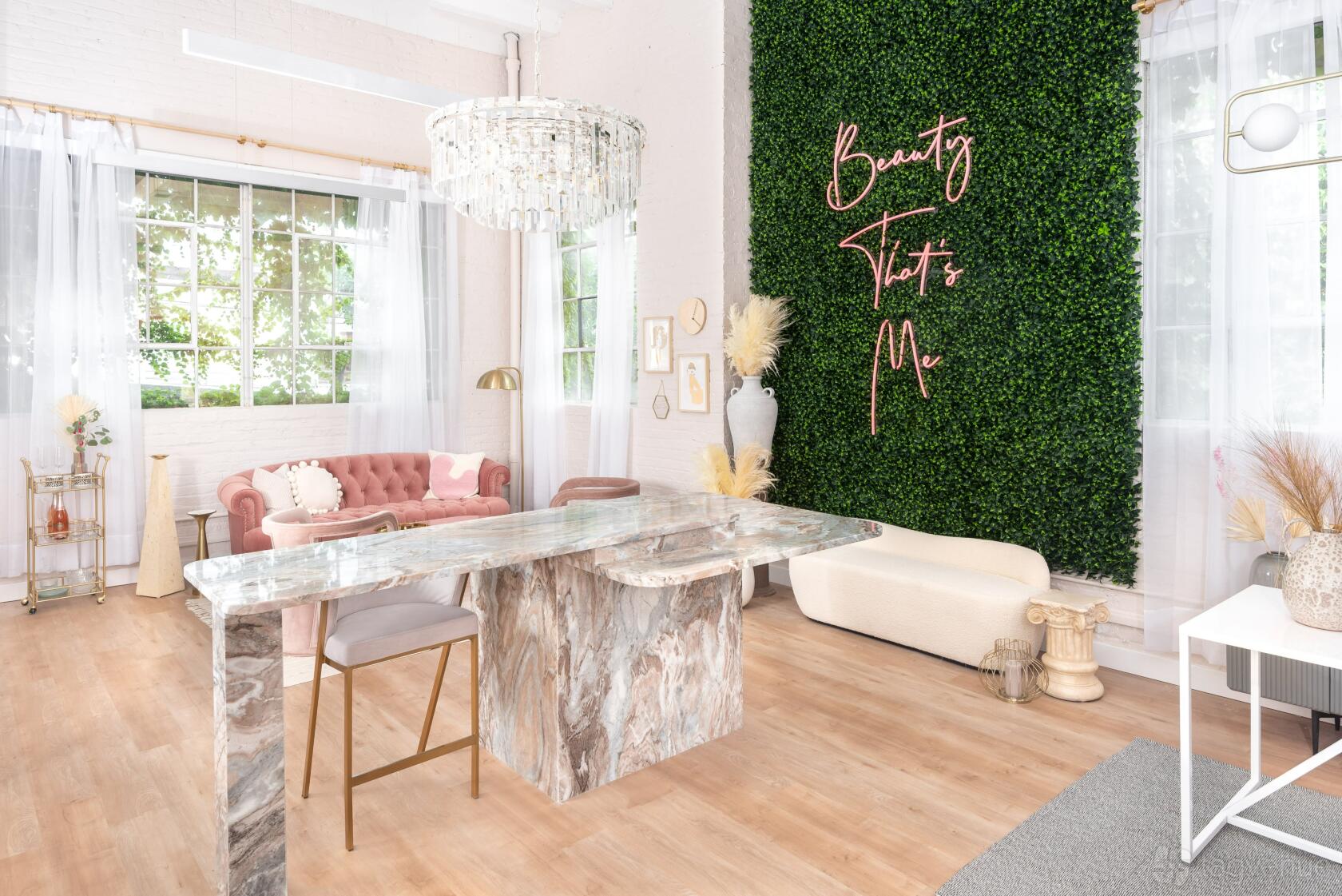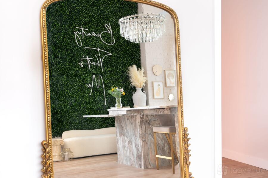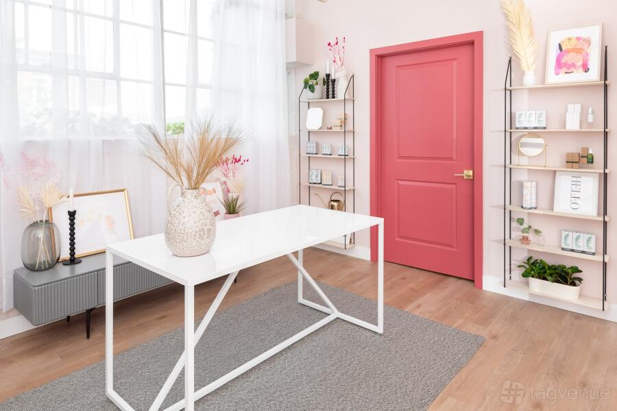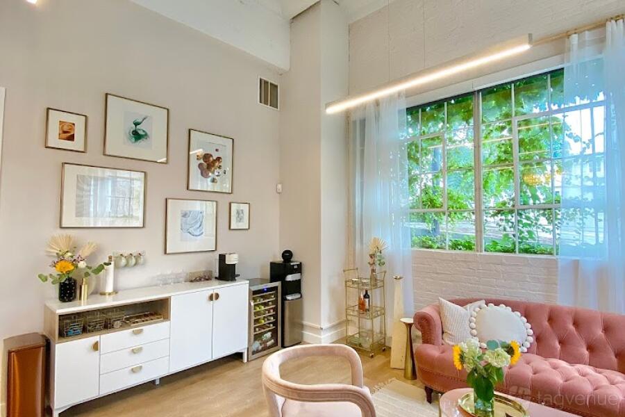 The soft pink accents, luxurious seating, and curated art installations offer a stunning backdrop, complemented by floor-to-ceiling windows that flood the space with natural light. Ideal for creatives and professionals seeking a versatile, refined environment for a variety of purposes.
