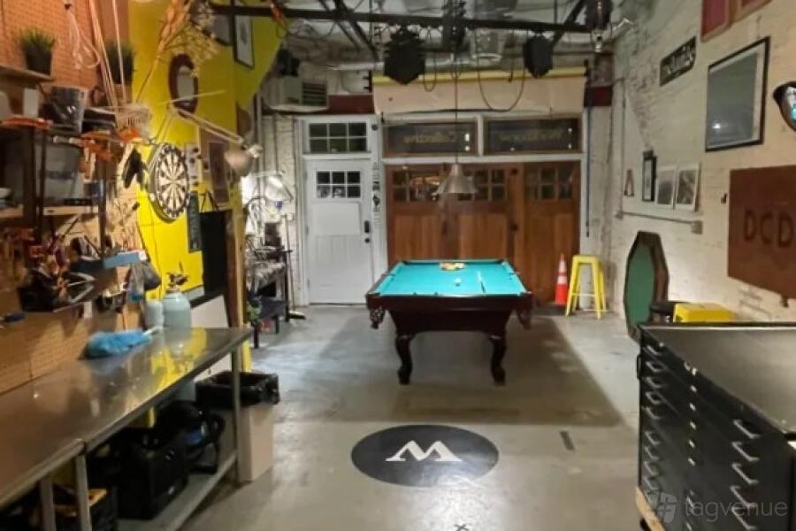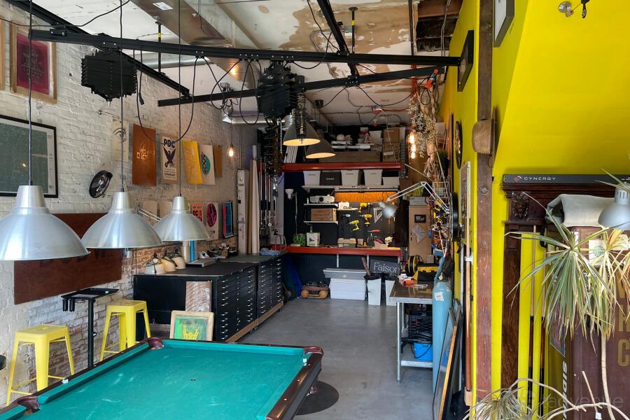 The ground floor offers a flexible workshop or maker space with workbenches, power tools, and an 8-foot pool table. A single bathroom is located on the second floor.