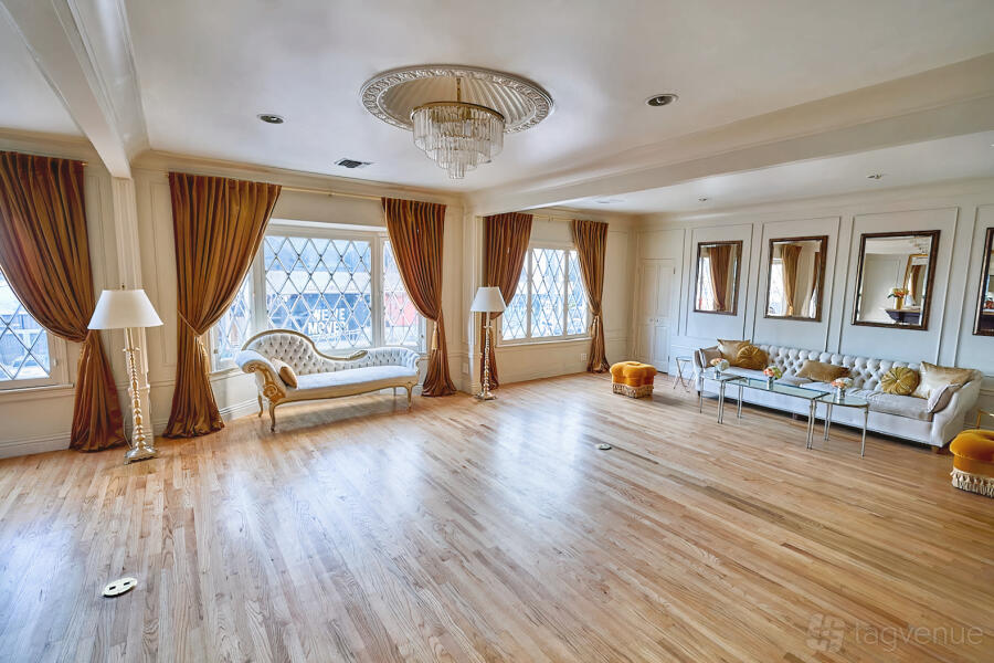 Furniture can be moved or stored to suit your event or shoot. The garden features a gold curtain and green wall backdrop, while the Den has a black alligator print. The space is flexible and easy to customize.