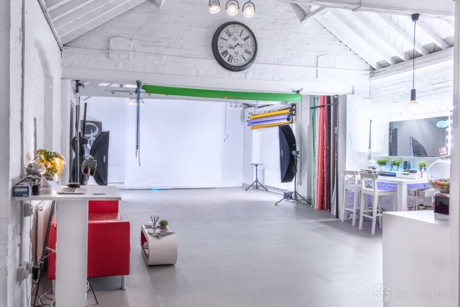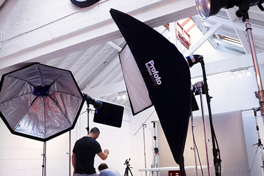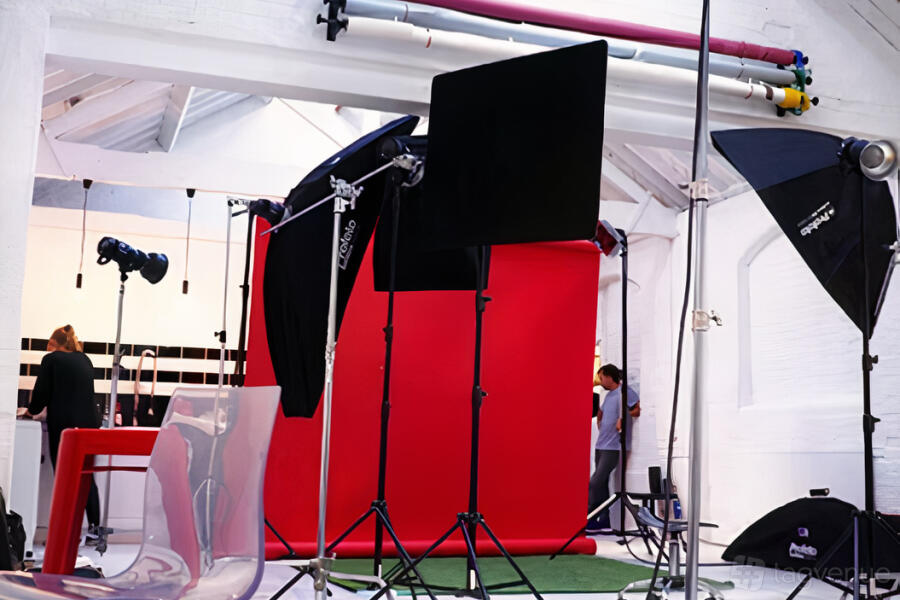With 6-meter-high ceilings and skylights, the venue offers two shooting spaces. There is our bright main studio and an all-black blackout studio for video and colored light work. The layout supports medium-sized productions. Two parking spaces, a fully equipped kitchen, a makeup area, and basic gear are included in your hire. We also offer a full production service—from styling to post-production.