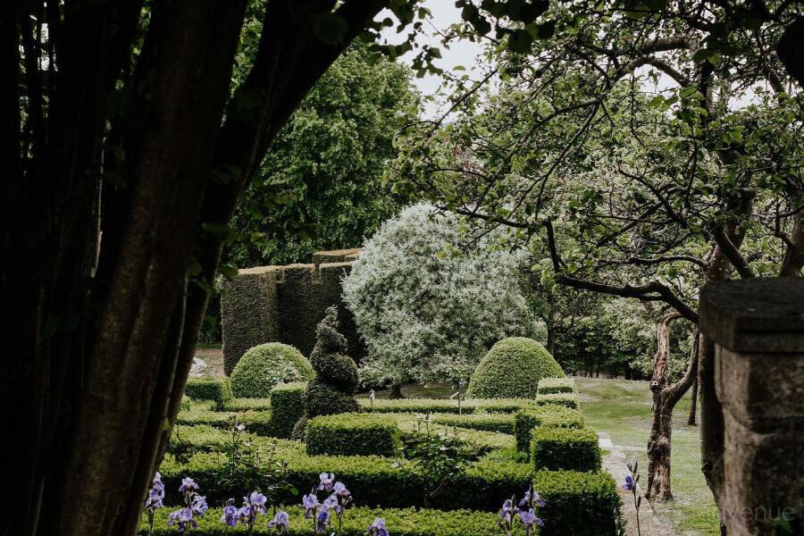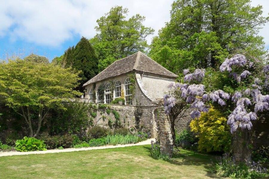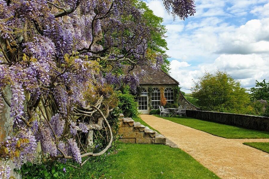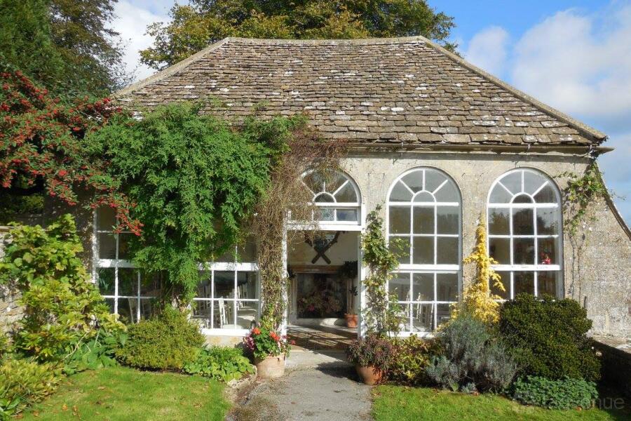 The orangery in the grounds is the 18th century with high arched windows and a Cotswold stone roof. The extensive gardens are terraced with a network of decorative stone walls and feature a pergola, a herb garden, a kitchen garden and traditional greenhouses. The house is set in the Cotswold Area of Outstanding Natural Beauty at the end of a long drive.