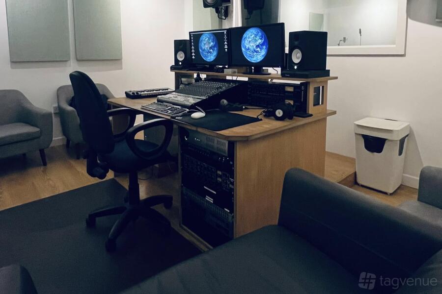 Our equipment includes high-end monitors, recording interfaces, and microphones. The live room is perfect for vocals and instruments. The rooms are connected through a large window. Parking is available nearby.