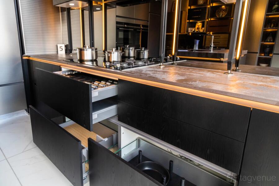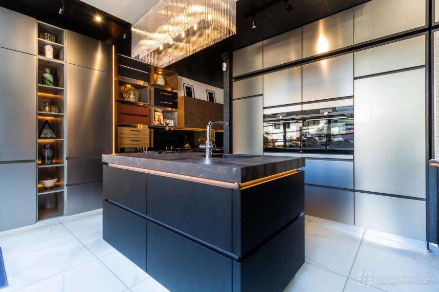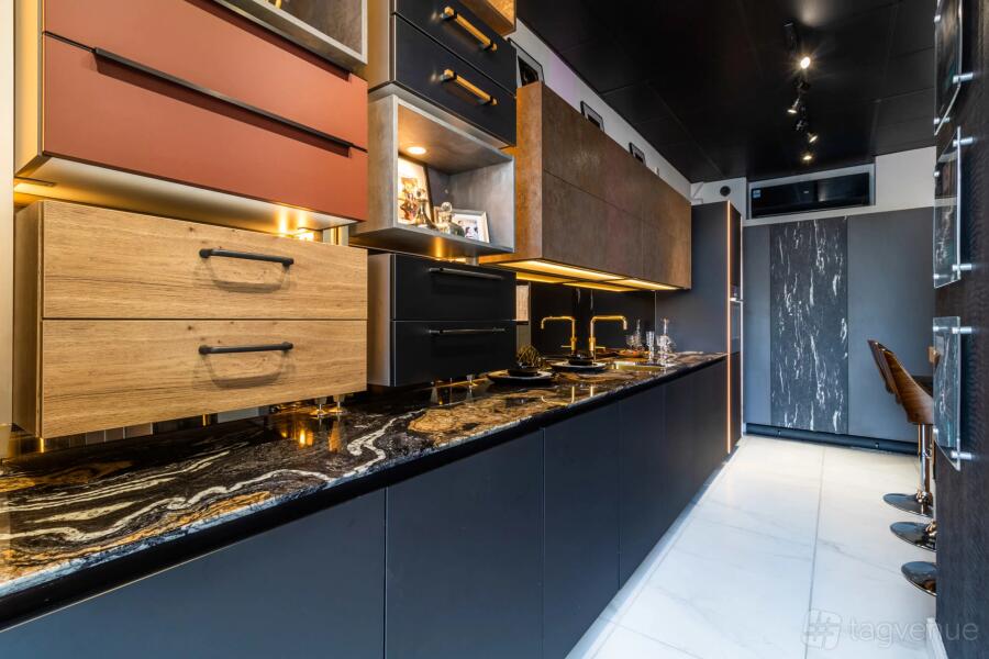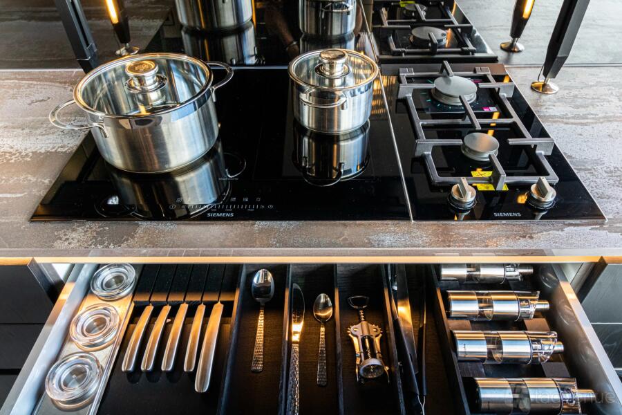 The kitchen is fully functional, with amenities such as Ovens, Hob (induction), Downdraft and wall-mounted extractor, boiling water tap, Fridge Freezer, Dishwasher, etc. All will look amazing for your video/promo with the lighting and design of the space.
